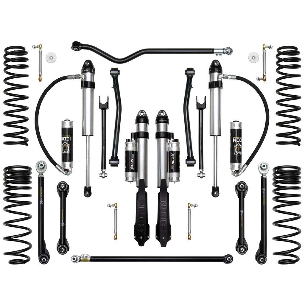 The Stage 8 ICON 2.5” Suspension System for the Jeep Gladiator is the ultimate setup for drastically improving off-road performance and providing an end-user adjustable ride quality for the application that will see heavy off-road use across a wide variety of vehicle loadouts and terrains. This complete suspension system features ICON’s proven 2.5 Aluminum Series shocks with CDC Valve technology, 2.5” lift dual-rate front coil springs, tubular steel fixed lower and adjustable upper front links, billet front sway bar links, a triple-rate rear coil spring kit, tubular steel fixed upper and adjustable lower rear links, a billet rear sway bar link kit, front and rear adjustable track bars, and all necessary hardware for install. This system provides an increase of over 30% front and 20% rear wheel travel and was designed around the use of a 35” tire. For those looking to run a 37” tire this can be achieved with the ICON Jeep JT Bump Stop Spacer Kit (Part #22071).