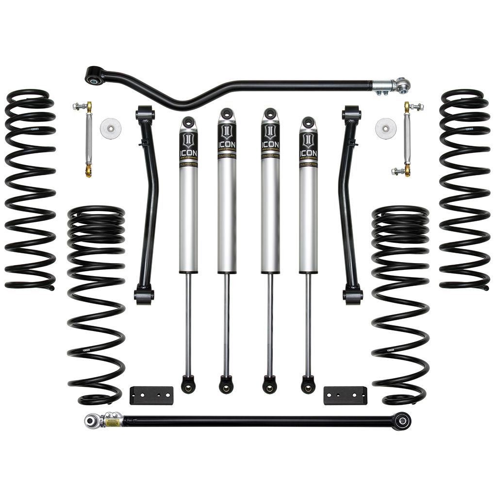 The Stage 4 ICON 2.5” Suspension System for the Jeep Gladiator is the ideal setup for drastically improving on-road ride quality and overall performance for the daily driven application that will see frequent, moderate off-road use. This complete suspension system features 2.0 Aluminum Series shocks, 2.5” lift dual-rate front coil springs, a tubular steel fixed front lower link kit, billet front sway bar links, a triple-rate rear coil spring kit, a rear sway bar relocation kit, front and rear adjustable track bars, and all necessary hardware for install. This system provides an increase of over 30% front and 20% rear wheel travel and was designed around the use of a 35” tire. For those looking to run a 37” tire this can be achieved with the ICON Jeep JT Bump Stop Spacer Kit (Part #22071).