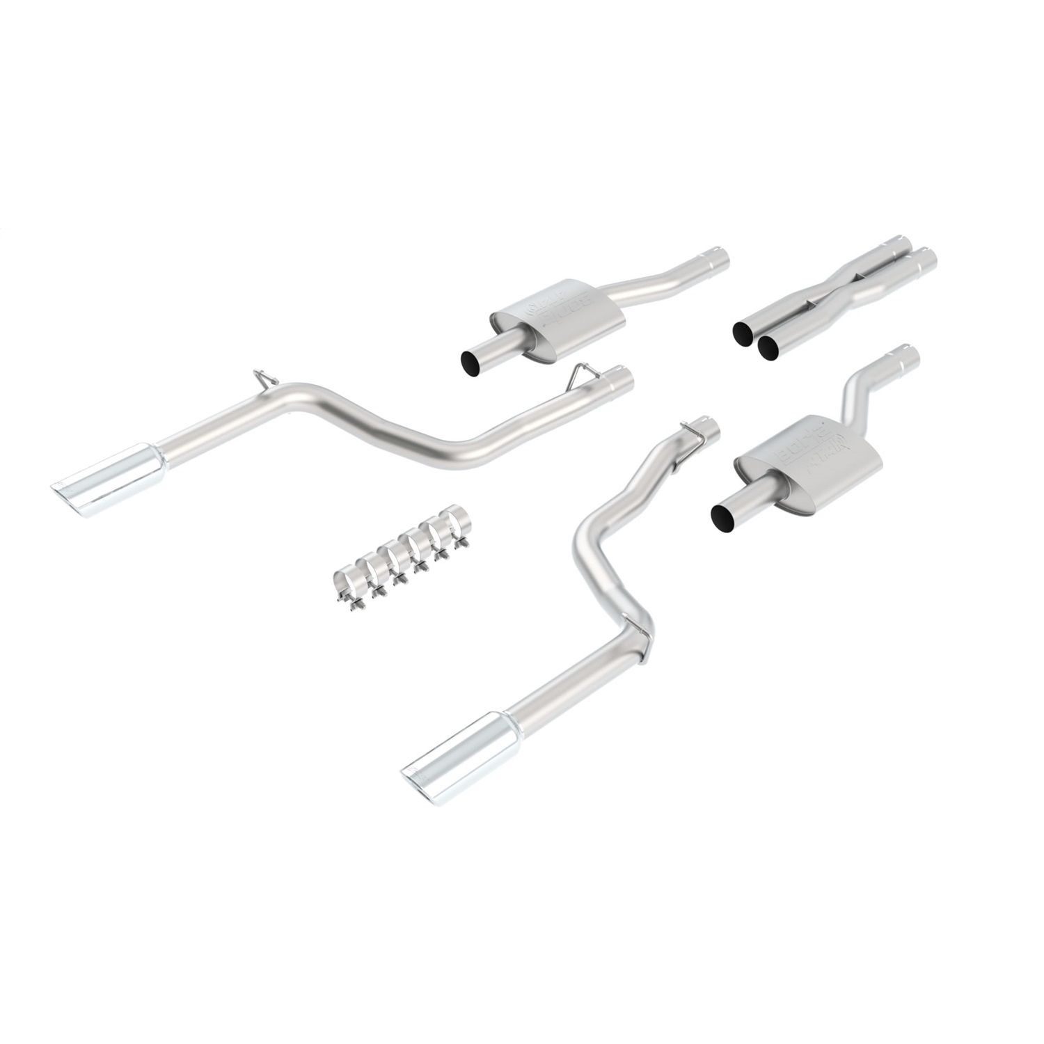 This system features a merge X-Pipe and 2.75" pipe throughout for increased performance and improved sound. It is perfectly suited for additional engine modifications. This system features the aggressive ATAK(r) sound and exits through 4" bright chrome on T-304 stainless steel tips. Borla(r) Cat-Back(tm) & Axle-Back exhaust systems feature patented straight-through and multi-core technology to unleash hidden horsepower. Increased exhaust velocity adds power, driving excitement, fuel economy, and the distinctive Borla(r) Sound of Power respected by motoring enthusiasts everywhere. Each system is built from premium T-304 austenitic stainless steel, superior to T-400 series knockoffs (such as 409), to give you the absolute best in performance and durability. Ultra-smooth mandrel bends ensure maximum flow & power, and precision computer numeric control (CNC) manufacturing ensures an accurate fit. Best of all, Borla(r) stands behind every system with a Million-Mile Warranty. Just what you'd expect from the world's most experienced (and most winning) exhaust brand.