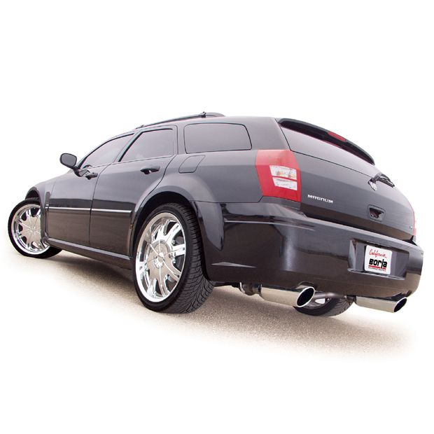 The bold look and feel of the Chrysler 300C, Dodge Magnum and Charger made big waves within the entire auto industry, and Borla(r) Performance Industries' custom power-tuned Cat-Back(tm) Exhausts deliver another home run. Borla(r) has a rich, 40 plus year heritage of designing and building leading edge components for Mopar vehicles. Borla(r)'s Cat-Back(tm) systems are true dual mandrel bent, high performance units designed for ease of installation and solid performance gains. The system contains a merge X-Pipe to unleash hidden horsepower and improve sound. Borla(r)'s knowledge of the 5.7L Hemi engine allowed us to custom tune an exhaust system which is almost 30 lbs. lighter than the stock system, mainly due to the aircraft-grade high quality T-304 austenitic lightweight stainless steel used in every Borla(r) system. Additional attributes include superior performance and that famous Borla(r) growl of power. This S-Type system features massive 5" round Borla(r) embossed rolled edge angle-cut bright chrome on T-304 stainless steel tips. The 140125 system flows 220cfm over stock, which helps explain why so much extra horsepower is released by this unique split rear exiting system. While many exhaust companies talk about racing, Borla(r) mufflers and headers are tested every single weekend on race tracks around the world. The Borla(r) success is unmatched, and that effort transfers to the Borla(r) street systems. Borla(r) backs these and every street Cat-Back(tm) system with an unequaled written million-mile warranty.