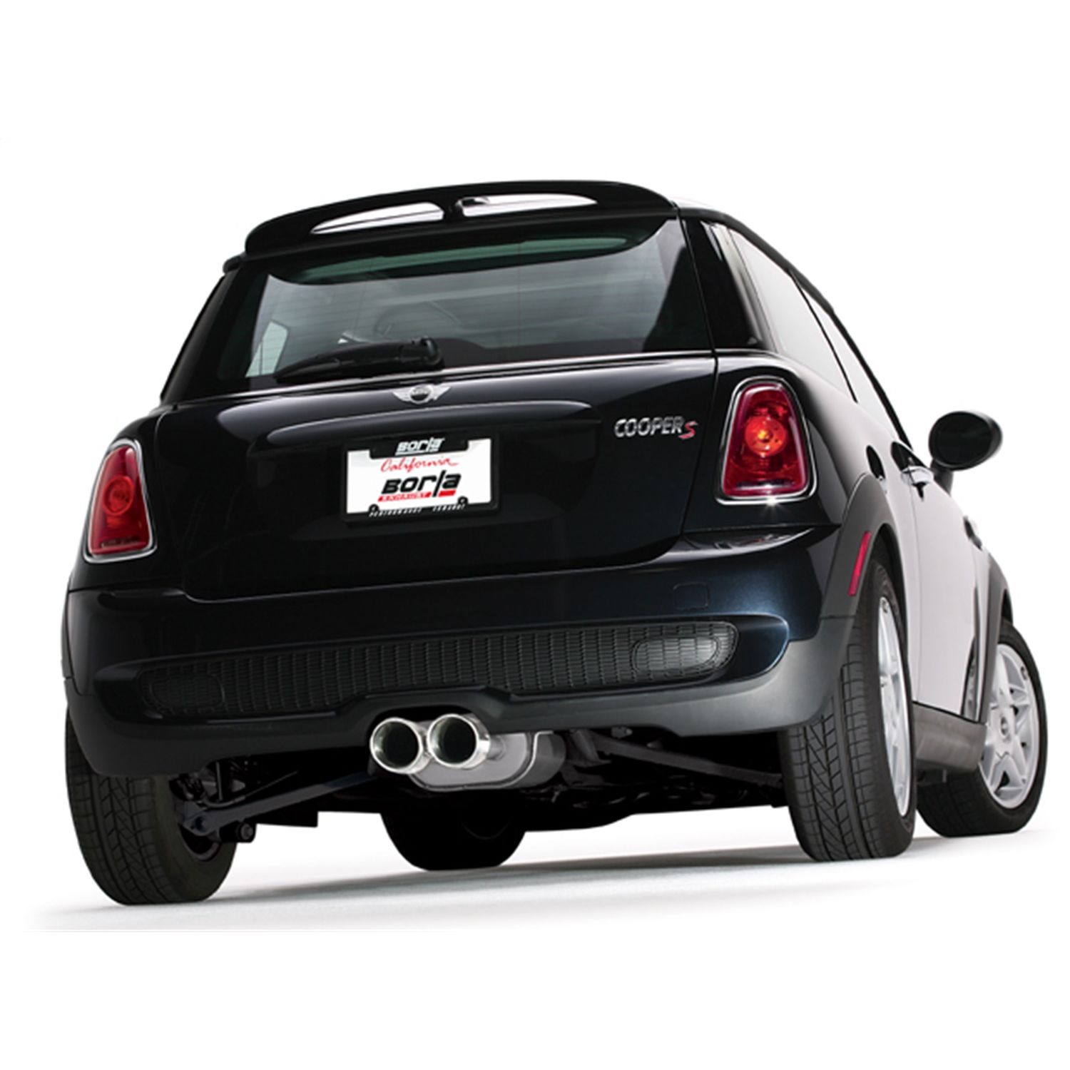 This 2.25" diameter Cat-Back(tm) system delivers the classic S-type sound with no drone inside the vehicle. The dual outlet muffler has single 4" round mirror polished T-304 stainless steel tips on each outlet. Borla(r) Cat-Back(tm) & Axle-Back exhaust systems feature patented straight-through and multi-core technology designed to unleash hidden horsepower. Increased exhaust velocity adds power, driving excitement, fuel economy, and the distinctive Borla(r) Sound of Power respected by motoring enthusiasts everywhere. Each system is built from premium T-304 stainless steel, superior to T-400 series knockoffs (such as 409), to give you the absolute best in performance and durability. Ultra-smooth mandrel bends ensure maximum flow & power, and precision computer numerical control (CNC) manufacturing ensures an accurate fit. Give your Mini Cooper S the power and sound it deserves, bolt on a Borla(r) . Best of all, Borla(r) stands behind every system with a Million-Mile Warranty. Just what you'd expect from the world's most experienced (and most winning) exhaust brand.