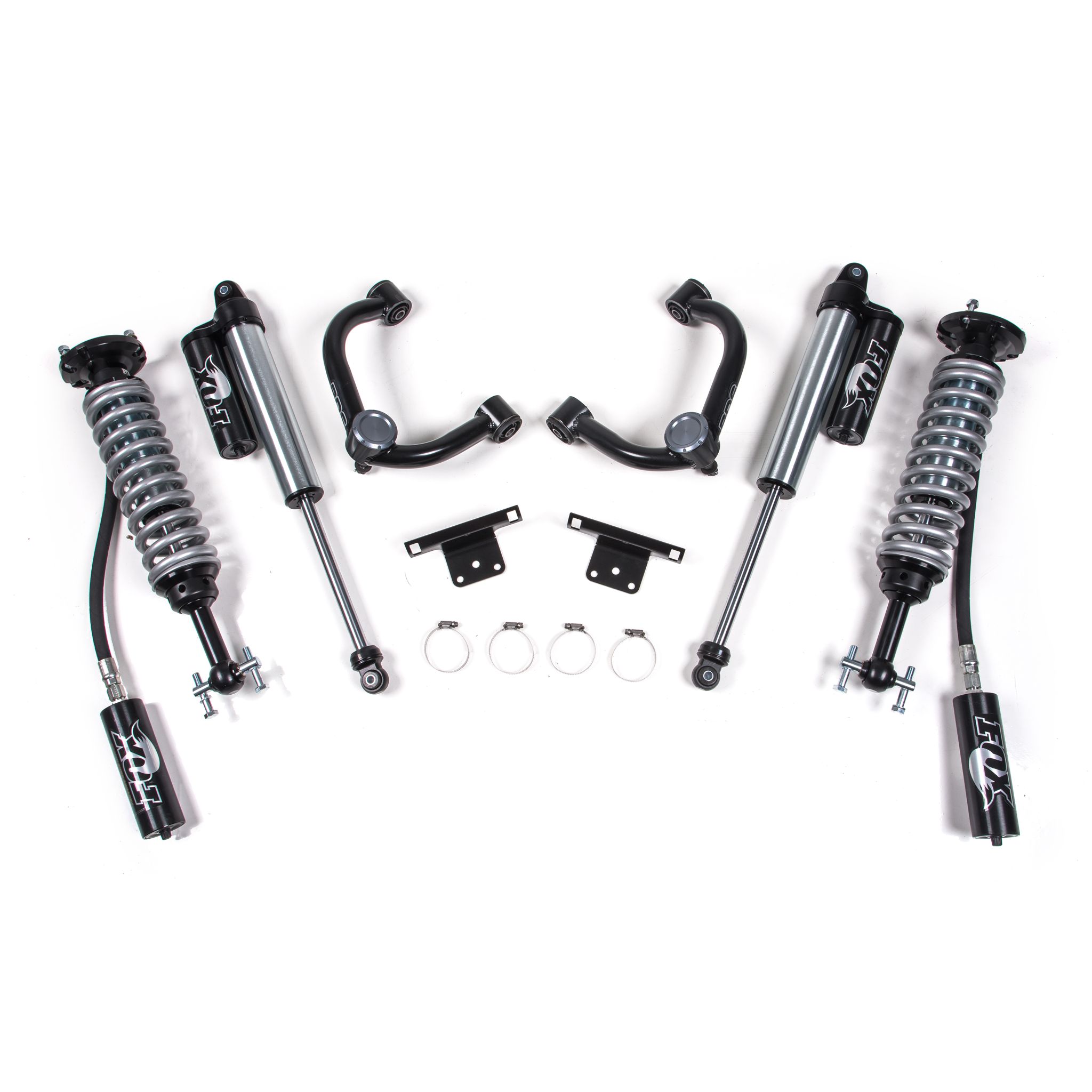 <p>Up front the lift kit includes FOX 2.5 Factory Series remote reservoir coilover shocks and heavy duty tubular upper control arms for increased strength. In the rear this kit utilizes a complementary set of FOX 2.0 Performance shocks for the smoothest ride.</p>