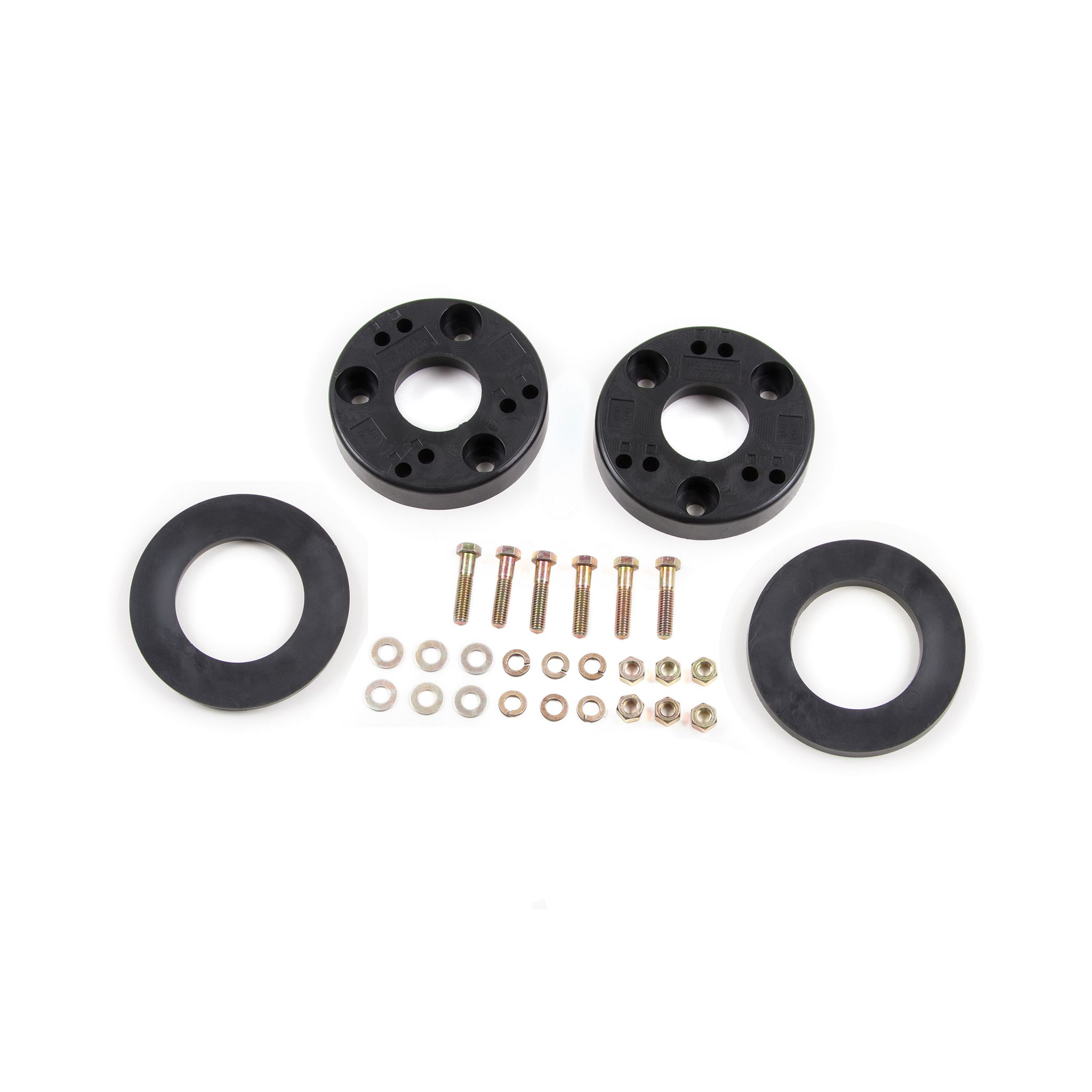 <p>Up front the lift kit includes new upper strut mount as well as pre-load spacers. Unlike other systems on the market, the two piece system does not max out the upper ball joints during suspension travel.</p>