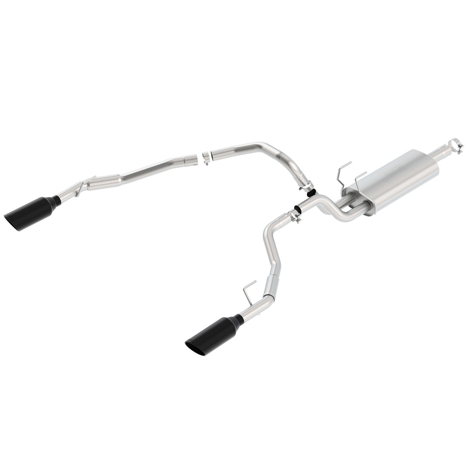 Fits through the factory bumper cut-outs (bumper has notches on the bottom). This 3" diameter into dual 2.5" Cat-Back™ system features the classic S-type sound with no drone inside the vehicle and exits thru single 5" round black chrome on T-304 stainless steel tips on each tail pipe. Using BORLA® Stainless Steel Polish p# 21461 is NOT recommended with these black chrome tips. We suggest cleaning the tips with hot water and a microfiber cloth. A system with bright chrome on T-304 stainless steel tips is also available. BORLA® Cat-Back™ & Axle-Back exhaust systems feature patented straight-through and multi-core technology to unleash hidden horsepower. Increased exhaust velocity adds power, driving excitement, fuel economy, and the distinctive BORLA® Sound of Power respected by motoring enthusiasts everywhere. Each system is built from premium, high-quality T-304 austenitic stainless steel, superior to T-400 series knockoffs (such as 409), to give you the absolute best in performance and durability. Ultra-smooth mandrel bends ensure maximum flow & power, and precision computer numerical control (CNC) manufacturing ensures an accurate fit. Best of all, BORLA® stands behind every system with a Million-Mile Warranty. Just what you'd expect from the world's most experienced (and most winning) exhaust brand.