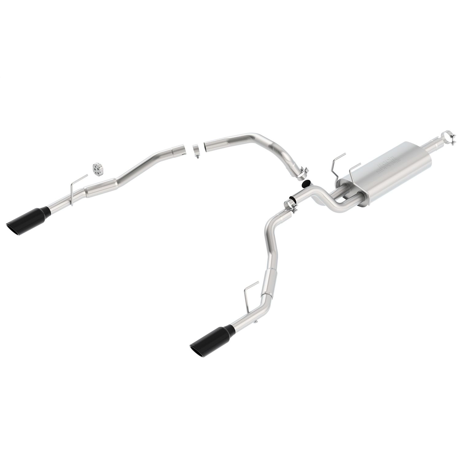 Converts vehicles with factory single exhaust to dual exhaust. Fits underneath the factory bumper. This 3" diameter into dual 2.5" Cat-Back™ system features the classic S-type sound with no drone inside the vehicle and exits thru single 4" round black chrome on T-304 stainless steel tips. Using BORLA® Stainless Steel Polish p# 21461 is NOT recommended with these black chrome tips. We suggest cleaning the tips with hot water and a microfiber cloth. A system with bright chrome onT-304 stainless steel tips is also available. BORLA® Cat-Back™ and Axle-Back exhaust systems feature patented straight-through and multi-core technology designed to unleash hidden horsepower. Increased exhaust velocity adds power, driving excitement, fuel economy, and the distinctive BORLA® Sound of Power respected by motoring enthusiasts everywhere. Each system is built from premium, high-quality austenitic T-304 stainless steel, superior to T-400 series knockoffs (such as 409), to give you the absolute best in performance and durability. Ultra-smooth mandrel bends ensure maximum flow & power, and precision computer numerical control (CNC) manufacturing ensures an accurate fit. Best of all, BORLA® stands behind every system with a Million-Mile Warranty. Just what you'd expect from the world's most experienced (and most winning) exhaust brand.
