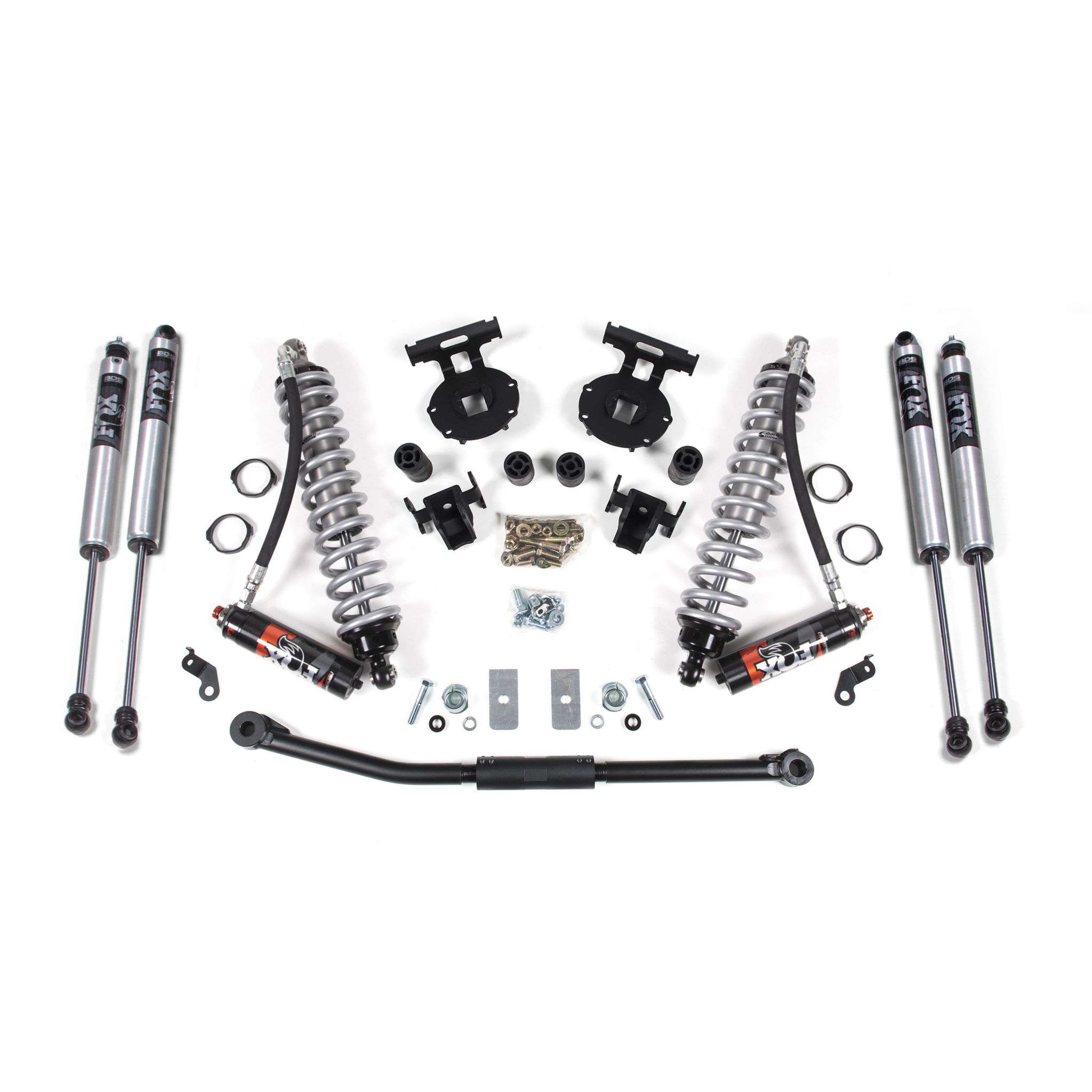 <p>Up front the lift kit includes diesel-specific FOX 2.5 coilover shocks, high strength 1-3/8 inch solid steel track bar for steering correction, brake line brackets and precision tuned nitrogen charged shocks.</p>