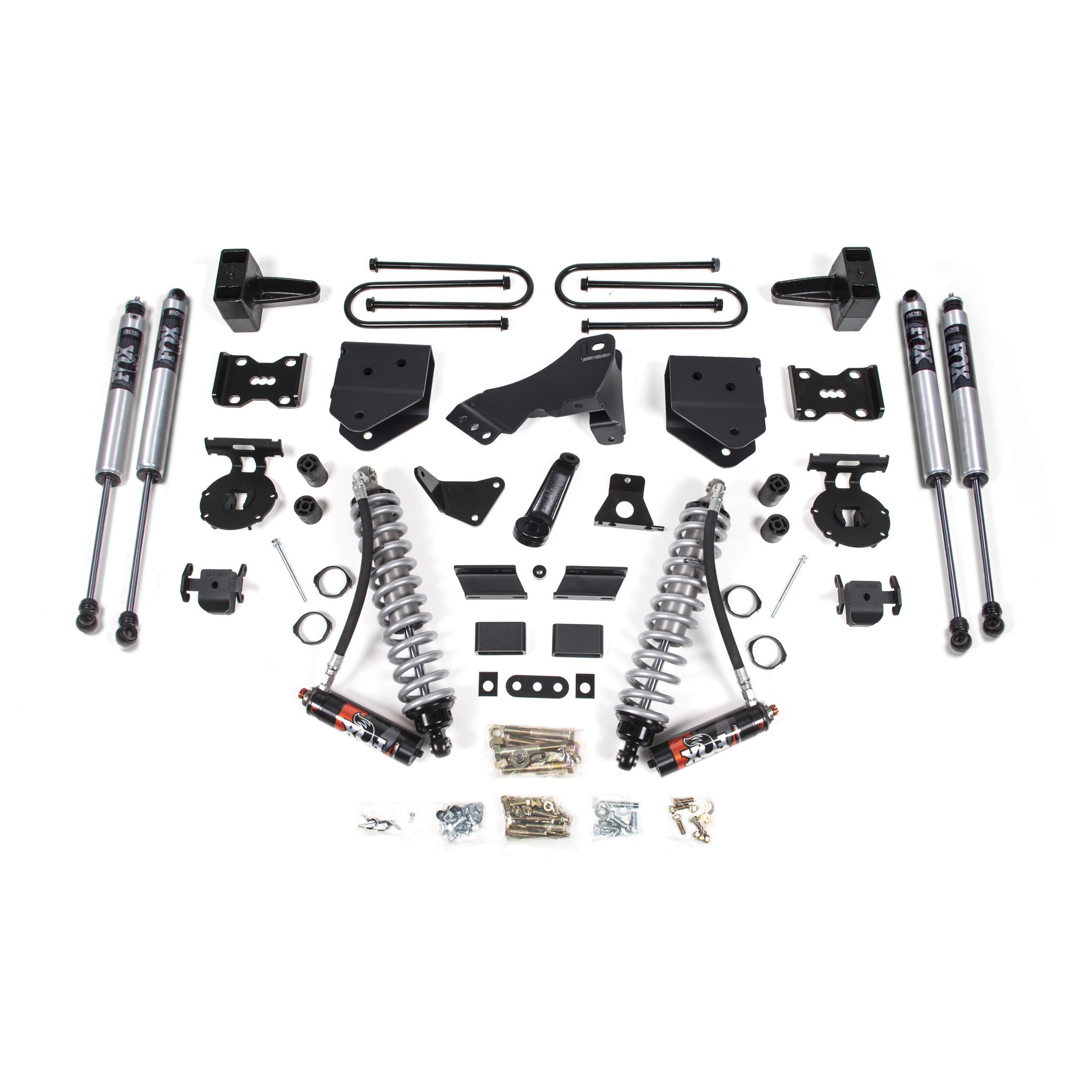 <p>Up front the lift kit includes diesel-specific FOX 2.5 coil-over shocks, heavy-duty radius arm drop brackets, forged drop pitman arm and track bar bracket for steering correction, sway bar relocation, brake line brackets and precision tuned FOX secondary shocks.</p>
