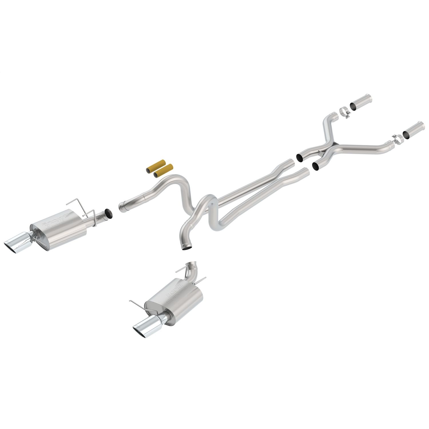 System contains a merge X-Pipe for increased performance and improved sound. Features bright chrome on T-304 stainless steel tips. Borla(r) Cat-Back(tm) & Axle-Back exhaust systems feature patented straight-through and multi-core technology designed to unleash hidden horsepower. Increased exhaust velocity adds power, driving excitement, fuel economy, and the distinctive Borla(r) Sound of Power respected by motoring enthusiasts everywhere. Each system is built from premium T-304 stainless steel, superior to T-400 series knockoffs (such as 409), to give you the absolute best in performance and durability. Ultra-smooth mandrel bends ensure maximum flow & power, and precision computer-controlled CNC manufacturing ensures an accurate fit. Best of all, Borla(r) stands behind every system with a Million-Mile Warranty. Just what you'd expect from the world's most experienced (and most winning) exhaust brand.