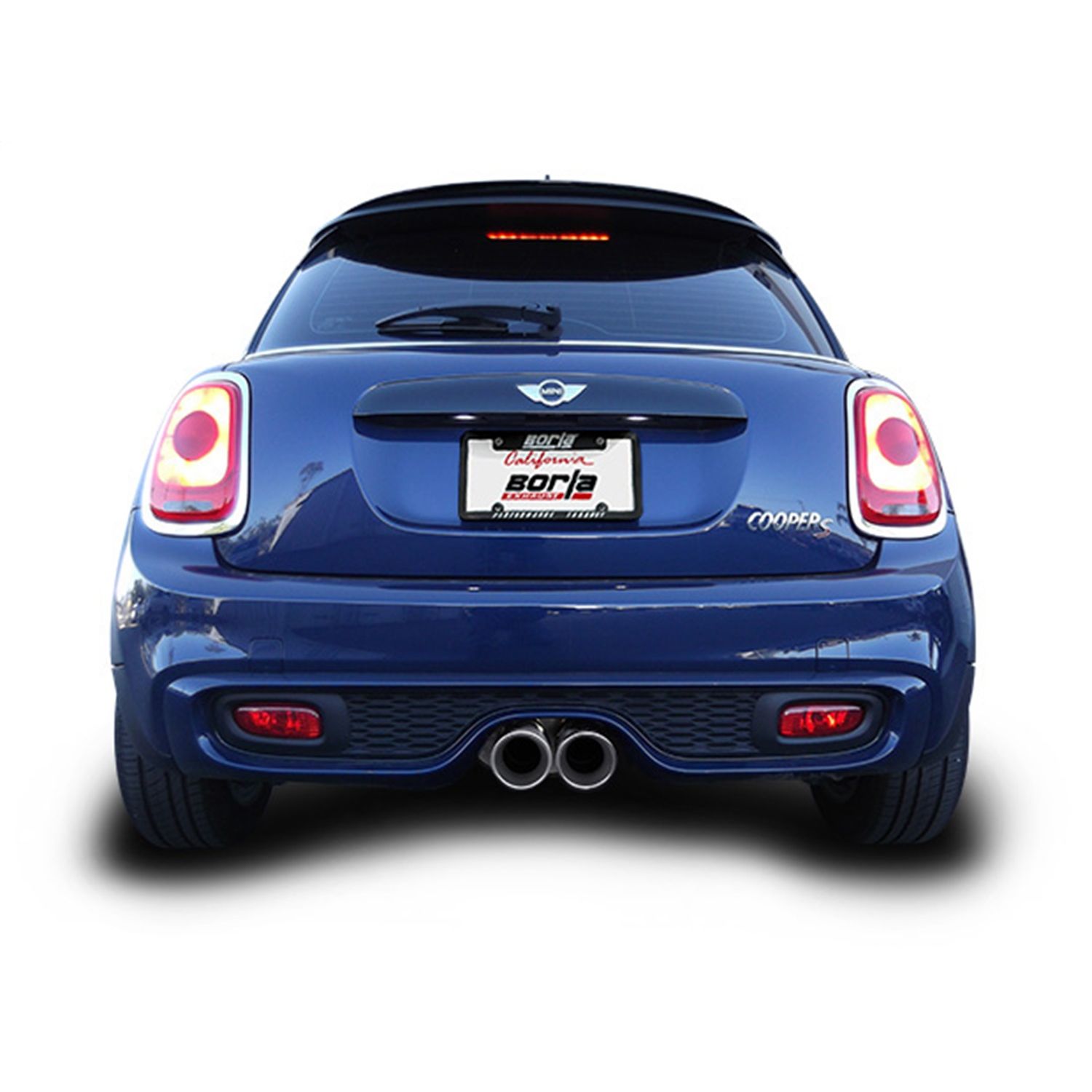 EXCEPT John Cooper Works. This 2.5" Borla(r) Cat-Back(tm) system delivers our mellow Touring sound with no drone inside the vehicle. It features 4" mirror polished T-304 stainless steel tips. Borla(r) Cat-Back(tm) & Axle-back exhaust systems feature patented straight-through and multi-core technology designed to unleash hidden horsepower. Increased exhaust velocity adds power, driving excitement, fuel economy, and the distinctive Borla(r) Sound of Power respected by motoring enthusiasts everywhere. Each system is built from premium T-304 stainless steel, superior to T-400 series knockoffs (such as 409), to give you the absolute best in performance and durability. Ultra-smooth mandrel bends ensure maximum flow & power, and precision computer numerical control (CNC) manufacturing ensures an accurate fit. Best of all, Borla(r) stands behind every system with a Million-Mile Warranty. Just what you'd expect from the world's most experienced (and most winning) exhaust brand.
