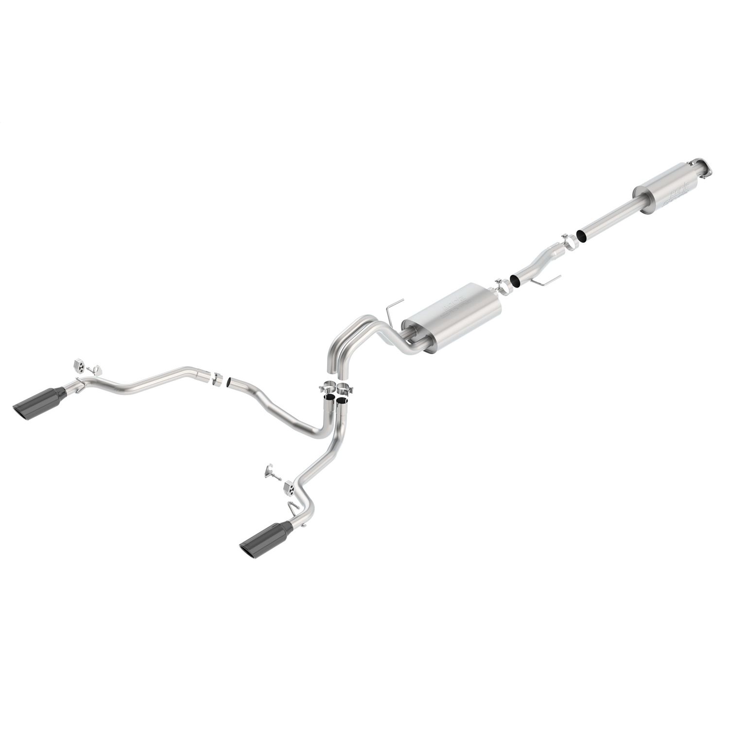 EXCEPT Raptor. Add Adapter 60556 for Crew Cab with Standard Bed (6' 7") 156.8" wheelbase, or Adapter 60564 for Ext. Cab with Long Bed (8' 2") 163.7" wheelbase. This 3" into dual 2.25" system features the clssic S-Type sound with no drone inside the vehicle and exits through 4" Black Chrome on T-304 stainless steel tips. Using Borla(r) Stainless Steel Polish p# 21461 is NOT recommended with these black chrome tips. We suggest cleaning the tips with hot water and a microfiber cloth. A system with bright chrome on T-304 stainless steel tips is also available. Borla(r) Cat-Back(tm) and Axle-Back exhaust systems feature patented straight-through and multi-core technology designed to unleash hidden horsepower. Increased exhaust velocity adds power, driving excitement, fuel economy, and the distinctive Borla(r) Sound of Power respected by motoring enthusiasts everywhere. Each system is built from premium, high-quality T-304 stainless steel, superior to T-400 series knockoffs (such as 409), to give you the absolute best in performance and durability. Ultra-smooth mandrel bends ensure maximum flow & power, and precision computer numerical control (CNC) manufacturing ensures an accurate fit. Best of all, Borla(r) stands behind every system with a Million-Mile Warranty. Just what you'd expect from the world's most experienced (and most winning) exhaust brand.