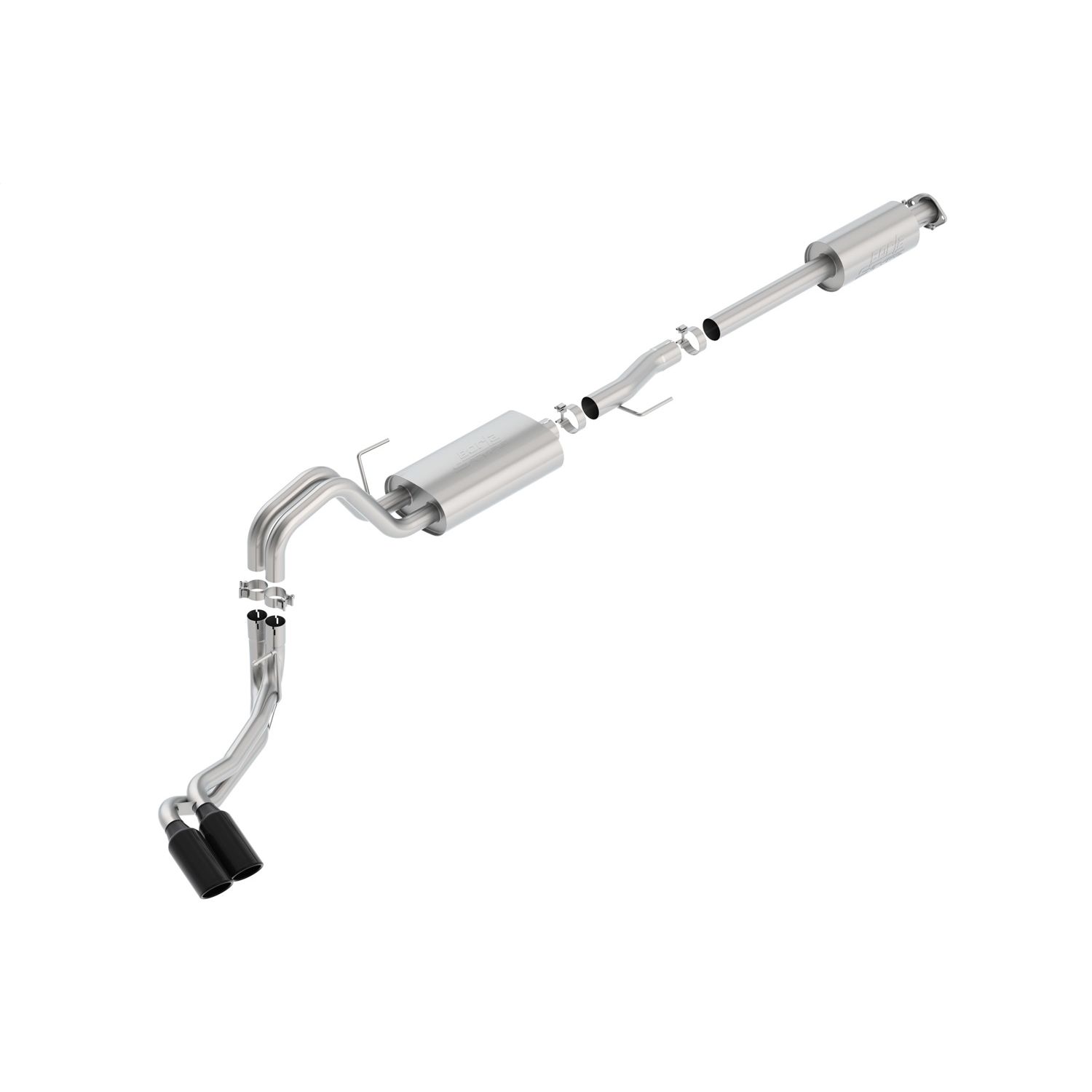 EXCEPT Raptor. Add Adapter 60556 for Crew Cab with Standard Bed (6' 7") 156.8" wheelbase, or Adapter 60564 for Ext. Cab with Long Bed (8' 2") 163.7" wheelbase. This 3" into dual 2.25" system features the classic S-Type sound with no drone inside the vehicle and exits through 4" black chrome on T-304 stainless steel tips. Using Borla(r) Stainless Steel Polish p# 21461 is NOT recommended with these black chrome tips. We suggest cleaning the tips with hot water and a microfiber cloth. A system with b chrome on T-304 stainless steel tips is also available. Borla(r) Cat-Back(tm) and Axle-Back exhaust systems feature patented straight-through and multi-core technology designed to unleash hidden horsepower. Increased exhaust velocity adds power, driving excitement, fuel economy, and the distinctive Borla(r) Sound of Power respected by motoring enthusiasts everywhere. Each system is built from premium, high-quality T-304 stainless steel, superior to T-400 series knockoffs (such as 409), to give you the absolute best in performance and durability. Ultra-smooth mandrel bends ensure maximum flow & power, and precision computer numerical control (CNC) manufacturing ensures an accurate fit. Best of all, Borla(r) stands behind every system with a Million-Mile Warranty. Just what you'd expect from the world's most experienced (and most winning) exhaust brand.