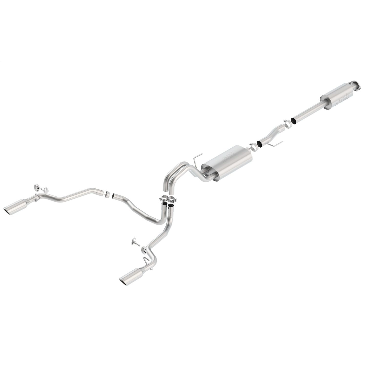 EXCEPT Raptor. Add Adapter 60556 for Crew Cab with Standard Bed (6' 7") 156.8" wheelbase, or Adapter 60564 for Ext. Cab with Long Bed (8' 2") 163.7" wheelbase. This 3" into dual 2.25" system features the classic S-Type sound with no drone inside the vehicle and exits through 4" bright chrome on T-304 stainless steel tips. A system with black chrome on T-304 stainless steel tips is also available. Borla(r) Cat-Back(tm) & Axle-Back exhaust systems feature patented straight-through and multi-core technology designed to unleash hidden horsepower. Increased exhaust velocity adds power, driving excitement, fuel economy, and the distinctive Borla(r) Sound of Power respected by motoring enthusiasts everywhere. Each system is built from premium T-304 stainless steel, superior to T-400 series knockoffs (such as 409), to give you the absolute best in performance and durability. Ultra-smooth mandrel bends ensure maximum flow & power, and precision computer numerical control (CNC) manufacturing ensures an accurate fit. Best of all, Borla(r) stands behind every system with a Million-Mile Warranty. Just what you'd expect from the worlds most experienced (and most winning) exhaust brand.