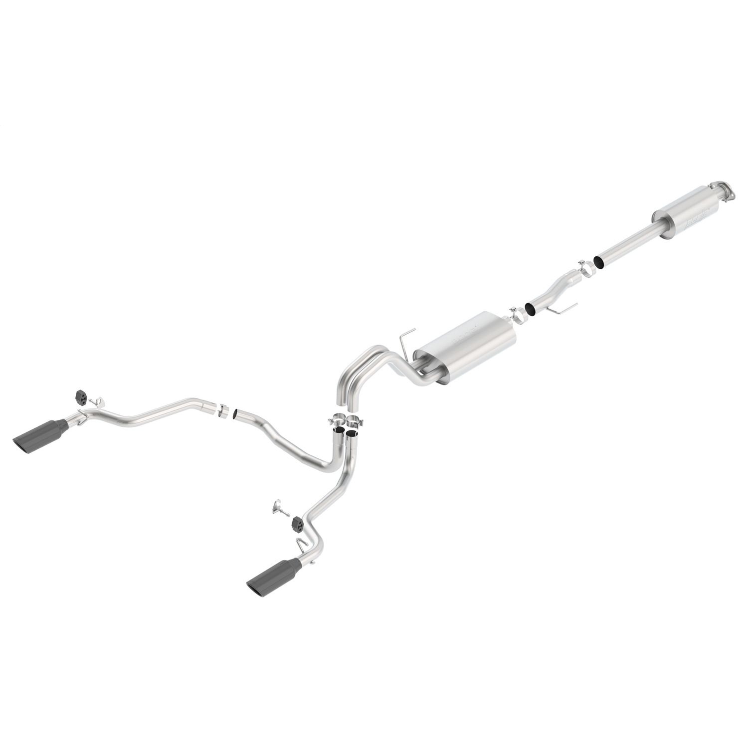 EXCEPT Raptor. Add Adapter 60556 for Crew Cab with Standard Bed (6' 7") 156.8" wheelbase, or Adapter 60564 for Ext. Cab with Long Bed (8' 2") 163.7" wheelbase. This 3"into dual 2.25" system features the mellow Touring sound with no drone inside the vehicle and exits through 4" Black Chrome on T-304 stainless steel tips. Using Borla(r) Stainless Steel Polish p# 21461 is NOT recommended with these black chrome tips. We suggest cleaning the tips with hot water and a microfiber cloth. A system with bright chrome on T-304 stainless steel tips is also available. Borla(r) Cat-Back(tm) and Axle-Back exhaust systems feature patented straight-through and multi-core technology designed to unleash hidden horsepower. Increased exhaust velocity adds power, driving excitement, fuel economy, and the distinctive Borla(r) Sound of Power respected by motoring enthusiasts everywhere. Each system is built from premium, high-quality T-304 stainless steel, superior to T-400 series knockoffs (such as 409), to give you the absolute best in performance and durability. Ultra-smooth mandrel bends ensure maximum flow & power, and precision computer numerical control (CNC) manufacturing ensures an accurate fit. Best of all, Borla(r) stands behind every system with a Million-Mile Warranty. Just what you'd expect from the world's most experienced (and most winning) exhaust brand.