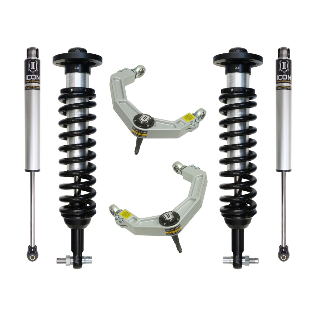This system features upper control arms with ICON's patented Delta Joint. The Delta Joint is a heavy duty high angle ball joint that combines the durability of a ball joint with the performance characteristics of a traditional uniball. While the industry standard uniball does a great job of allowing the control arms of a vehicle to articulate with little bind, they do have an inherent weakness that leaves more to be desired when used in a daily driven application – exposure to the elements. The Delta Joint features a zinc plated housing providing the first layer of corrosion resistance, while a tough grease seal keeps potentially harmful elements out of the inner workings of the joint. Metal on metal construction and a greasable design increase the longevity of the Delta Joint while at the same time allowing for noise-free operation. What makes the Delta Joint unique is that it brings the best of both worlds to ICON upper control arms with features that make it more robust than a uniball, and at the same time capable of greater angularity than a typical ball joint.