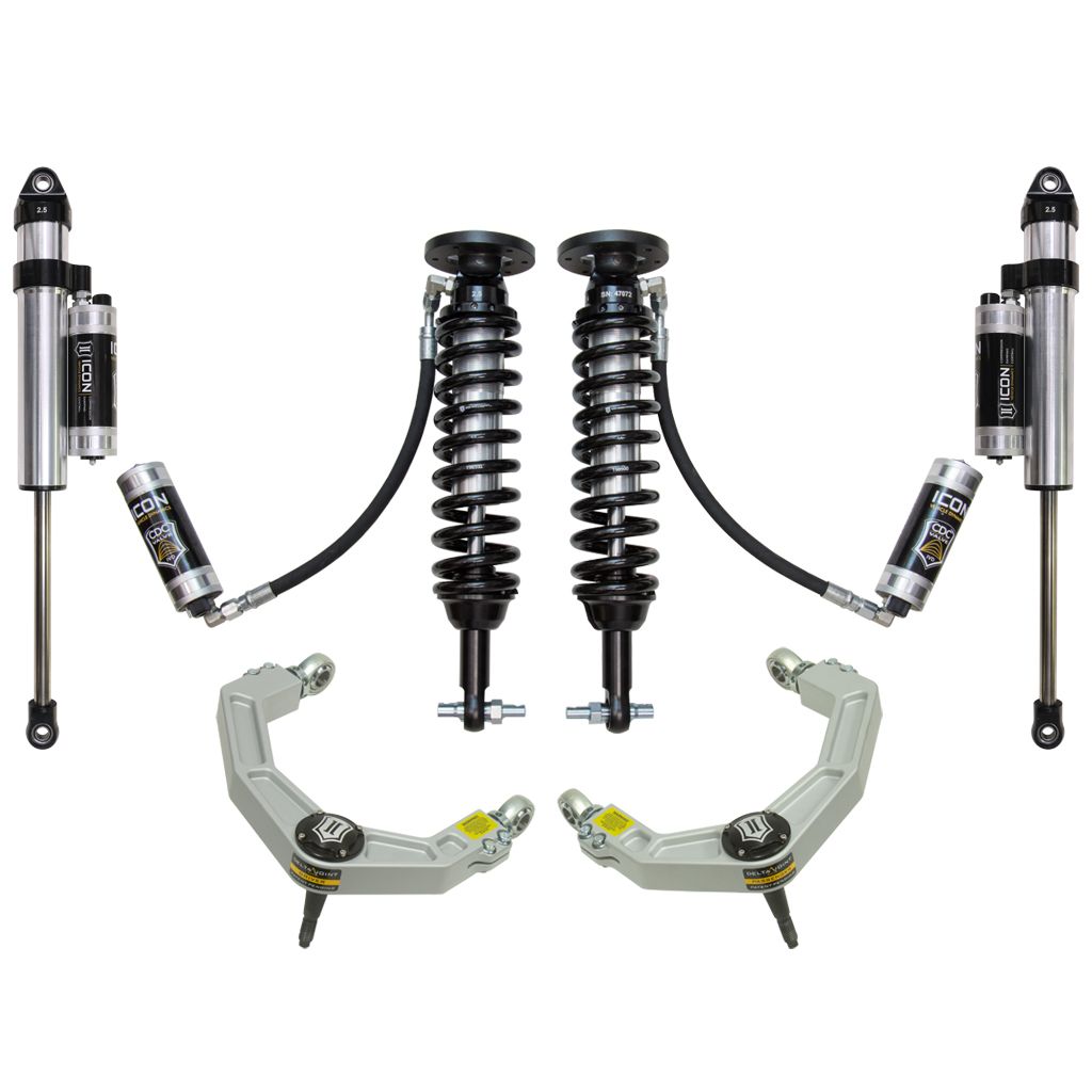 This system features upper control arms with ICON's patented Delta Joint. The Delta Joint is a heavy duty high angle ball joint that combines the durability of a ball joint with the performance characteristics of a traditional uniball. While the industry standard uniball does a great job of allowing the control arms of a vehicle to articulate with little bind, they do have an inherent weakness that leaves more to be desired when used in a daily driven application – exposure to the elements. The Delta Joint features a zinc plated housing providing the first layer of corrosion resistance, while a tough grease seal keeps potentially harmful elements out of the inner workings of the joint. Metal on metal construction and a greasable design increase the longevity of the Delta Joint while at the same time allowing for noise-free operation. What makes the Delta Joint unique is that it brings the best of both worlds to ICON upper control arms with features that make it more robust than a uniball, and at the same time capable of greater angularity than a typical ball joint.