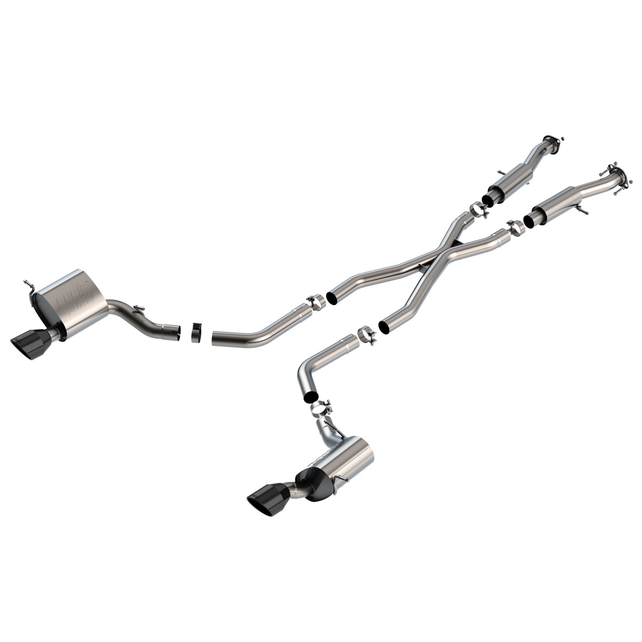 This system features the aggressive ATAK(r) sound and exits through 5" ceramic black on T-304 stainless steel tips. A system with bright chrome on T-304 stainless steel tips is also available. Borla(r) Cat-Back(tm) & Axle-Back multi-core technology is designed to unleash hidden horsepower. Increased exhaust velocity adds power, driving excitement, fuel economy, and the distinctive Borla(r) Sound of Power respected by motoring enthusiasts everywhere. The system contains a merge X-pipe for increased performance and improved sound. Each system is built from premium T-304 stainless steel, superior to T-400 series knockoffs (such as 409), to give you the absolute best in performance and durability. Ultra-smooth mandrel bends ensure maximum flow & power, and precision computer numerical control (CNC) manufacturing ensures an accurate fit. Best of all, Borla(r) stands behind every system with a Million-Mile Warranty. Just what you'd expect from the world's most experienced (and most winning) exhaust brand.