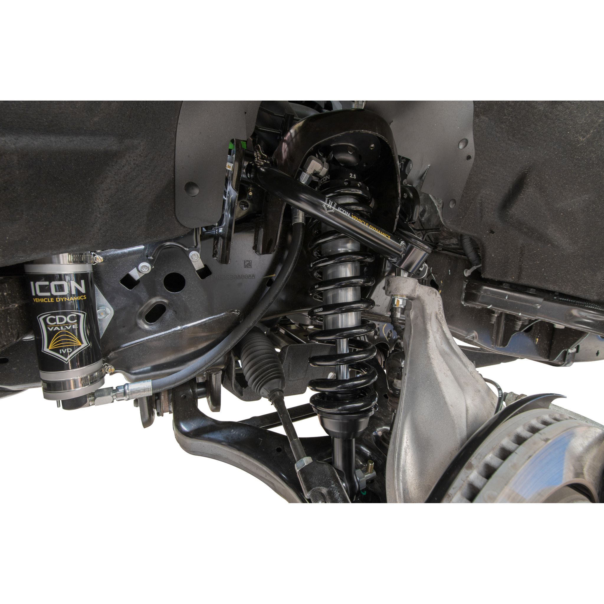 The ICON Vehicle Dynamics V.S. Series 2.5” remote reservoir coilover shocks w/ CDCV are an incredible upgrade for the front end of the 2015-2020 Ford F-150 4WD truck. ICON’s Vehicle-specific valving provides a sport tuned feel on and off-road while offering 2-2.63” of lift height adjustability for use of larger, more aggressive wheel and tire combinations. ICON's larger 2.5” shock body and increased piston area over stock components provides improved damping ability and outstanding ride characteristics across varying types of terrain. Remote reservoirs ensure optimum performance by increasing the duration of consistent damping regardless of situation, keeping the shocks at a cooler operating temperature during heavy use. The ICON CDC Valve upgrade is included for those desiring an easy way to tune the ride externally with 10 settings from soft to hard. When paired with ICON rear 2.0 Aluminum Series or 2.5 Series shocks, vehicle control will be balanced front to rear resulting in the best overall driving experience for your 2015-2020 F-150 4WD.