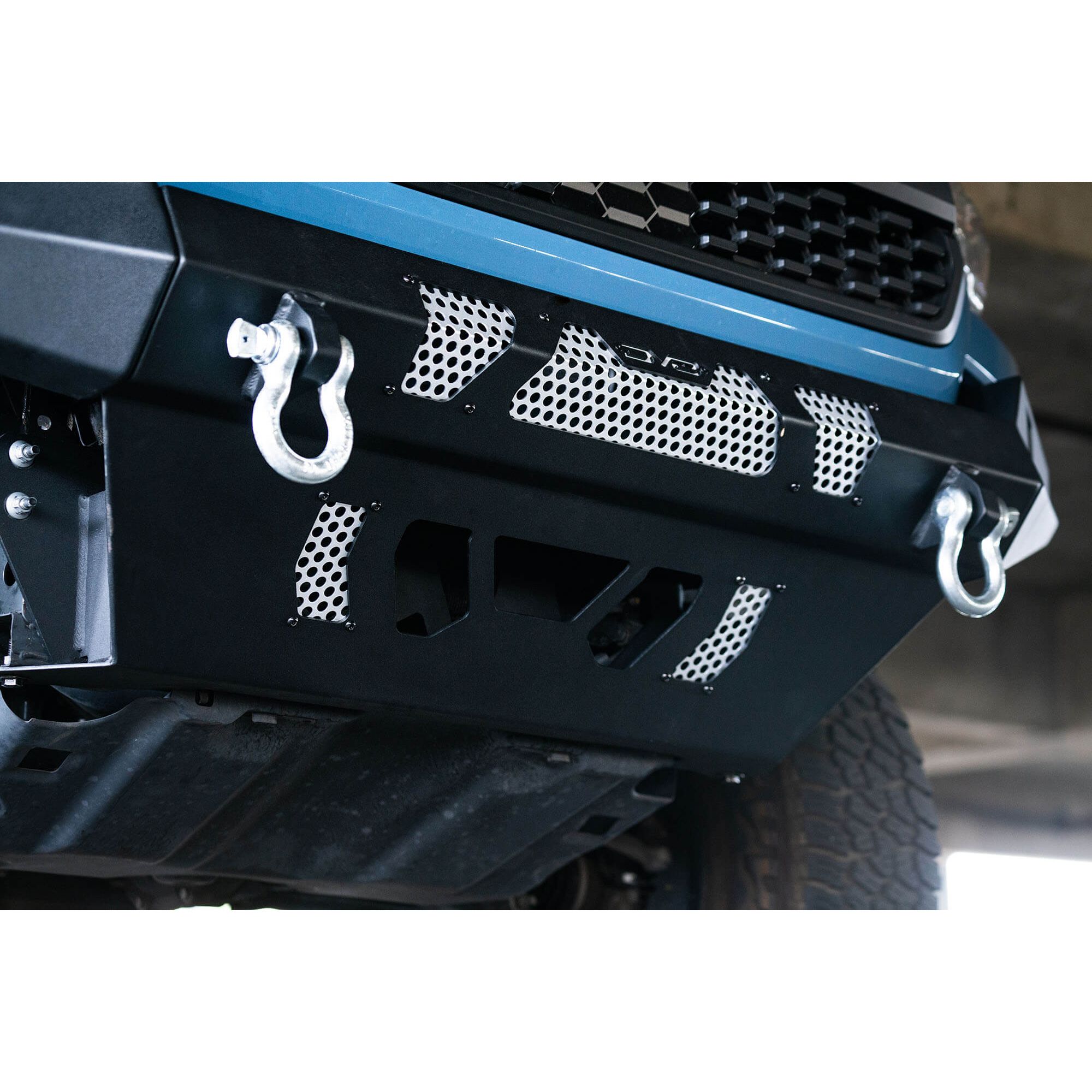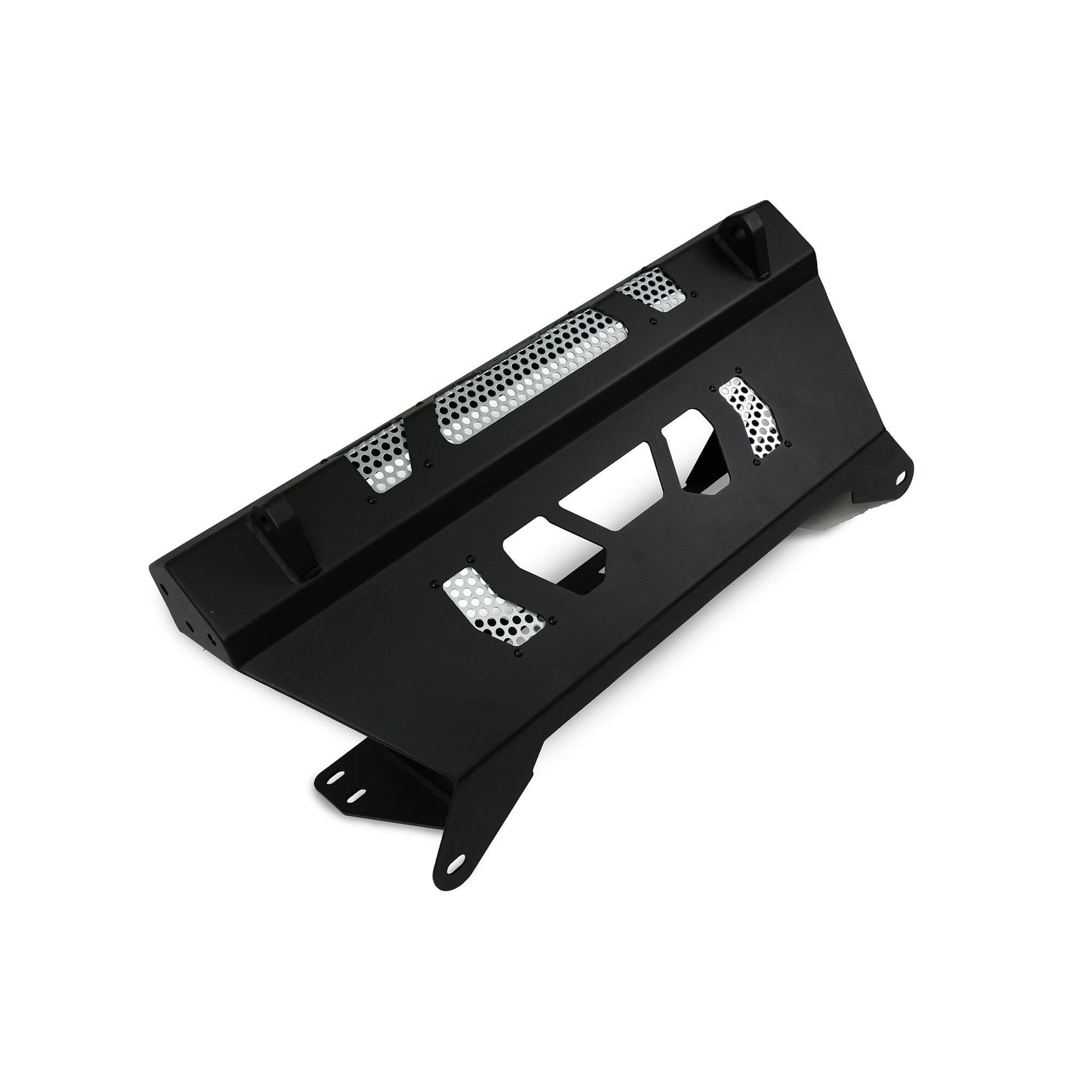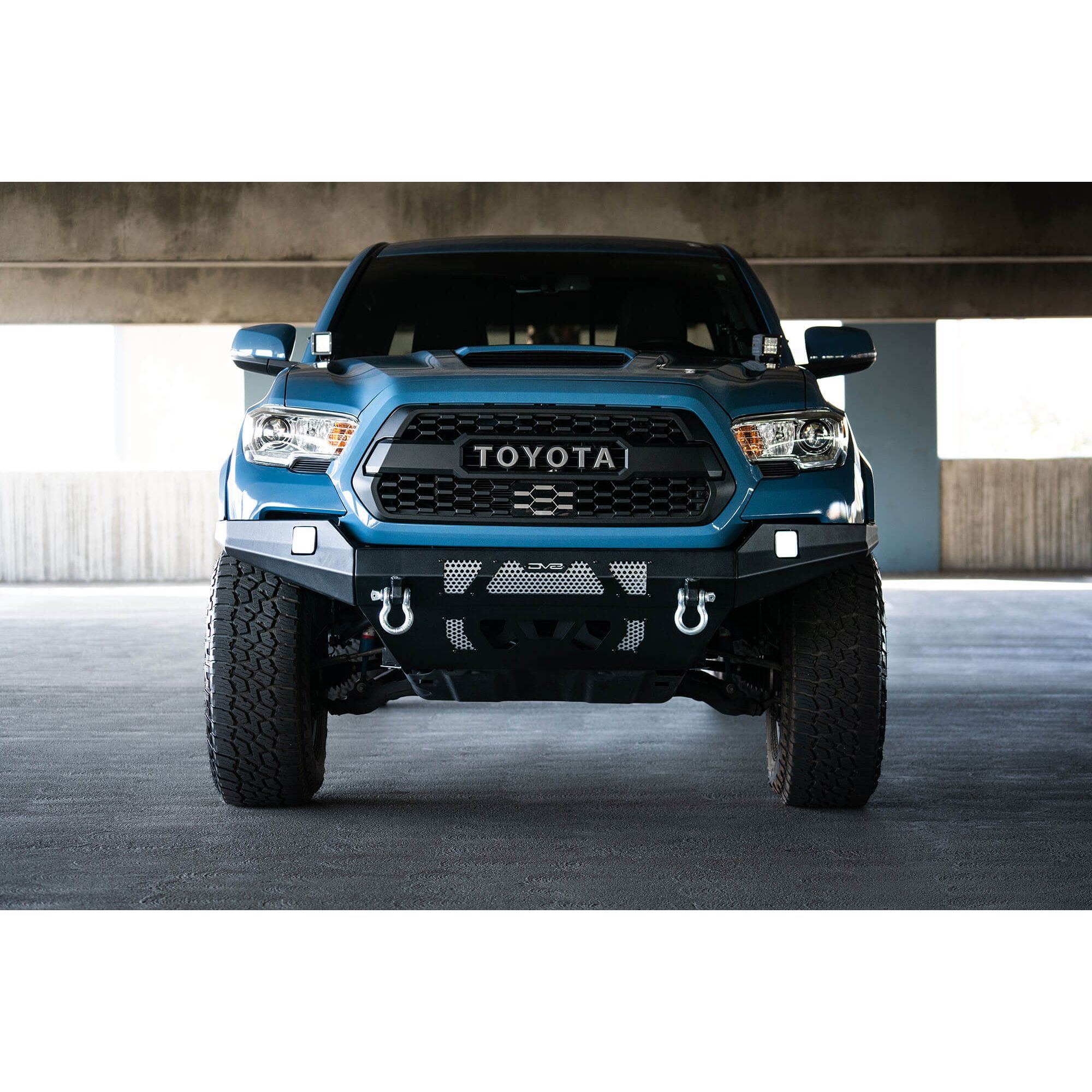 Our MTO Series Tacoma Front Bumper was designed to provide protection while driving off-road, and also increases your ground clearance and approach angle. The integrated bumper skid protects the Tacoma's front underbelly. The bumper wings are tapered to provide superior clearance, and feature a mount for a 3-inch light pod on either side. Additionally, a 20-inch dual row LED light bar can be mounted behind the central mesh panels.?Two heavily reinforced clevis mounts that take 3/4-inch D-ring shackles sit towards the center of the bumper. The bumper is constructed from 3.5mm steel plates with 5mm supports, and then finished in a Micro-Texture Black Powder Coat to prevent rust. All necessary hardware is included.