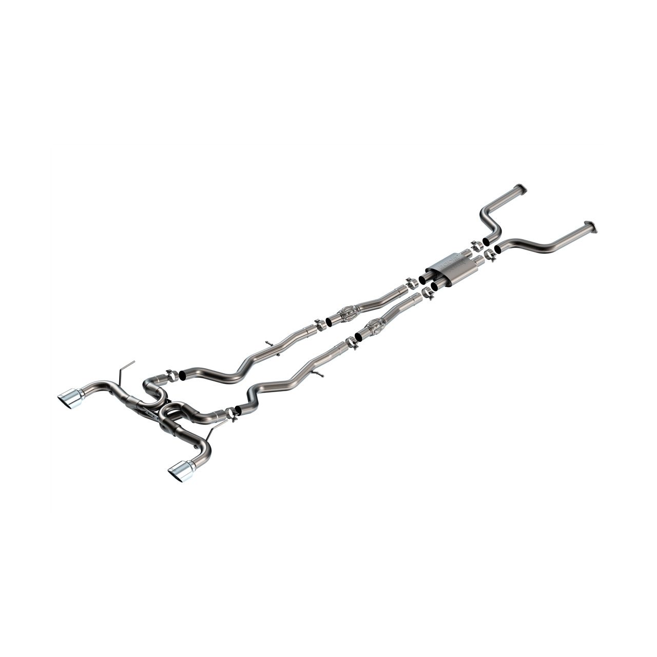 This 2.5" diameter Borla(r) Cat-Back(tm) system features an internal H-Pipe inside the front muffler and Borla(r)'s patented Polyphonic Harmonizer technology for increased performance and improved sound. Borla(r)'s Polyphonic Harmonizer Technology utilizes patented units that contain pipes of different diameters and lengths to create multiple exhaust notes that harmonize to deliver a clean, rich, full-bodied sound. The ATAK(r) sound level delivers an aggressive, head-turning sound without any drone inside the cabin. The rear section of this exhaust system incorporates Borla(r)'s patented SwitchFire(r) design, and a single 4.5" round bright chrome on T-304 stainless steel tip on each tail pipe. Completely eliminating the turbulent center intersection of a standard X-Pipe, Borla(r)'s patented SwitchFire(r) design truly blends the combustion pulses from both sides of the engine for improved performance and a custom sound. Systems with black chrome on T-304 stainless steel tips and carbon fiber tips are also available. Borla(r) Cat-Back(tm) & Axle-Back exhaust systems feature patented straight-through and multi-core technology to unleash hidden horsepower. Increased exhaust velocity adds power, driving excitement, fuel economy, and the distinctive Borla(r) Sound of Power respected by motoring enthusiasts everywhere. Each system is built from premium, high-quality T-304 austenitic stainless steel, superior to T-400 series knockoffs (such as 409), to give you the absolute best in performance and durability. Ultra-smooth mandrel bends ensure maximum a flow & power, and precision computer numerical control (CNC) manufacturing ensures an accurate fit. Best of all, Borla(r) stands behind every system with a Million-Mile Warranty. Just what you'd expect from the worlds most experienced (and most winning) exhaust brand.