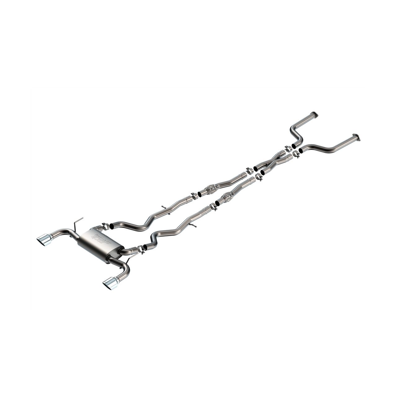This 2.5" diameter True Dual Borla(r) Cat-Back(tm) system as designed specifically for the Q50. It features a merge X-Pipe and Borla(r)'s patented Polyphonic Harmonizer technology for increased performance and improved sound. Borla(r)'s Polyphonic Harmonizer Technology utilizes patented units that contain pipes of different diameters and lengths to create multiple exhaust notes that harmonize to deliver a clean, rich, full-bodied sound. Completely eliminating the turbulent center intersection of a standard X-Pipe, The classic S-Type sound level delivers a sporty sound and a deeper tone without any drone inside the cabin. The system has a single 4.5" bright chrome on T-304 stainless steel tip on each tail pipe. Systems with black chrome on T-304 stainless steel tips, and carbon fiber tips are also available. Cat-Back(tm) & Axle-Back exhaust systems feature patented straight-through and multi-core technology to unleash hidden horsepower. Increased exhaust velocity adds power, driving excitement, fuel economy, and the distinctive Borla(r) Sound of Power respected by motoring enthusiasts everywhere. Each system is built from premium, high-quality T-304 austenitic stainless steel, superior to T-400 series knockoffs (such as 409), to give you the absolute best in performance and durability. Ultra-smooth mandrel bends ensure maximum a flow & power, and precision computer numerical control (CNC) manufacturing ensures an accurate fit. Best of all, Borla(r) stands behind every system with a Million-Mile Warranty. Just what you'd expect from the worlds most experienced (and most winning) exhaust brand.