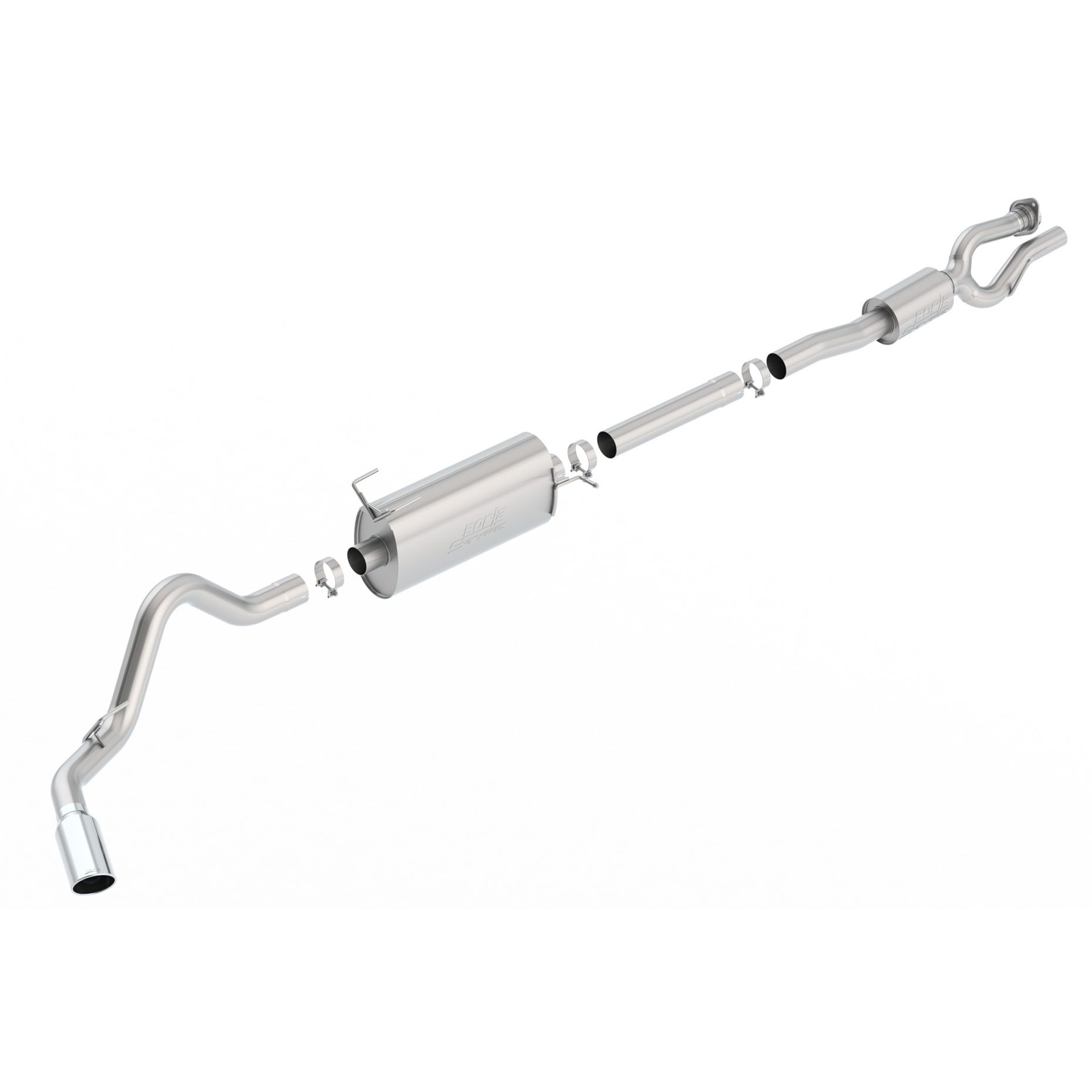 This dual 2.75" diameter into single 3" Cat-Back™ system was developed for use on F-250 and F-350 Super Duty trucks with performance, sound, style and durability in mind. The computer numerical control (CNC) formed mandrel bent pipes ensure maximum flow for horsepower and torque along with an accurate fit. The muffler is specifically designed to give the 6.2L engine the classic S-Type sound without any drone inside the vehicle. The system features a 5" round bright chrome on T-304 stainless steel tip. A system with a black chrome on T-304 stainless steel tip is also available. This system can be adapted to the different wheel bases offered by Ford. 140798 includes the front extension pipe for the Crew Cab with Short Bed (6' 9") 160" Wheelbase configuration. By removing the front extension pipe it will fit the Regular Cab with Long Bed (8') 142" Wheelbase. Add PN 60691 for Extended (Super Cab) with Short Bed (6' 9") 148" Wheelbase, PN 60692 for Extended (Super Cab) with Long Bed (8') 164" Wheelbase, or PN 60693 for Crew Cab with Long Bed (8') 176" Wheelbase vehicles. NONE of these systems or configurations will fit trucks with dual rear wheels. BORLA® Cat-Back™ & Axle-Back exhaust systems feature patented straight-through and multi-core technology to unleash hidden horsepower. Increased exhaust velocity adds power, driving excitement, fuel economy, and the distinctive BORLA® Sound of Power respected by motoring enthusiasts everywhere. Only T-304 stainless steel is used in the construction of BORLA® systems, that allows us to give you a Million Mile warranty.