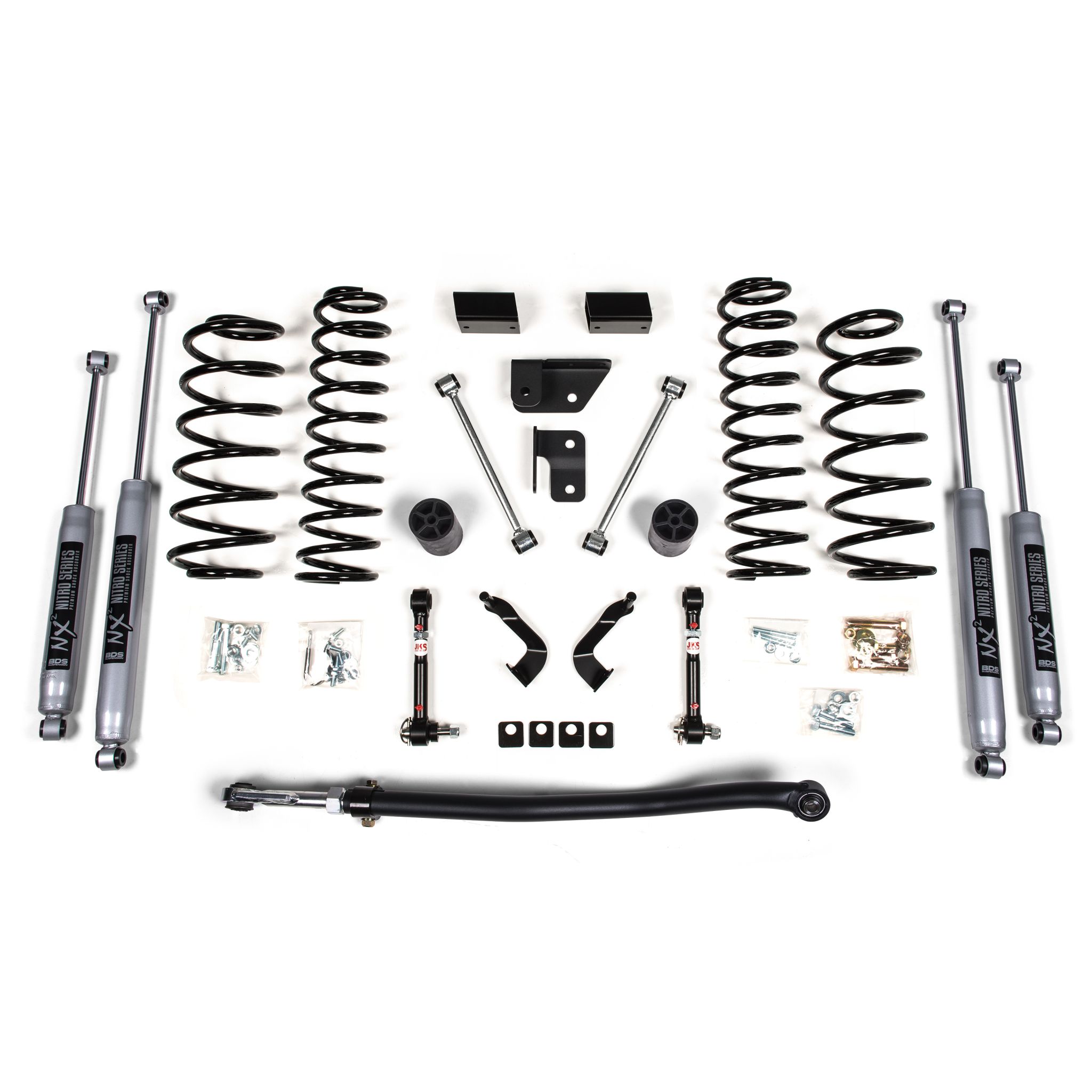 <p>The lift kit includes front and rear BDS Pro-Ride Coil Springs, a heavy duty adjustable front track bar is utilized to re-center the front axle, bump stop extensions, front lower control arm cam locks, JKS quicker disconnects to unlock the front suspension's potential to flex while maintaining quiet on road operation, rear sway bar links, and your choice of specially tuned NX2 nitro series gas shocks or FOX 2.0 IFP performance series gas shocks to offer improved damper performance.</p>