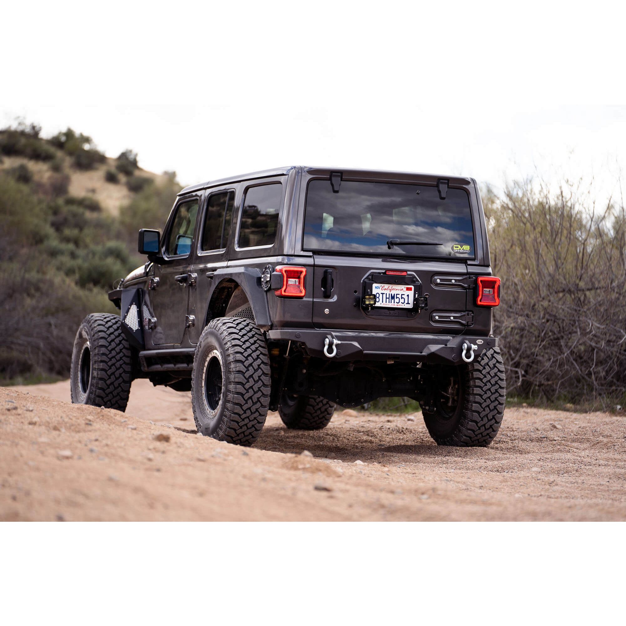 The DV8 Jeep JL Spare Tire delete not only covers the hole left by removing your spare tire mount, but also features a license plate mount with included plate lights. On each side of the delete, a pod light can be mounted to provide supplemental lighting when off-road. The back-up camera and third brake light are mounted directly into the DV8 spare tire delete, maintaining full functionality.?
