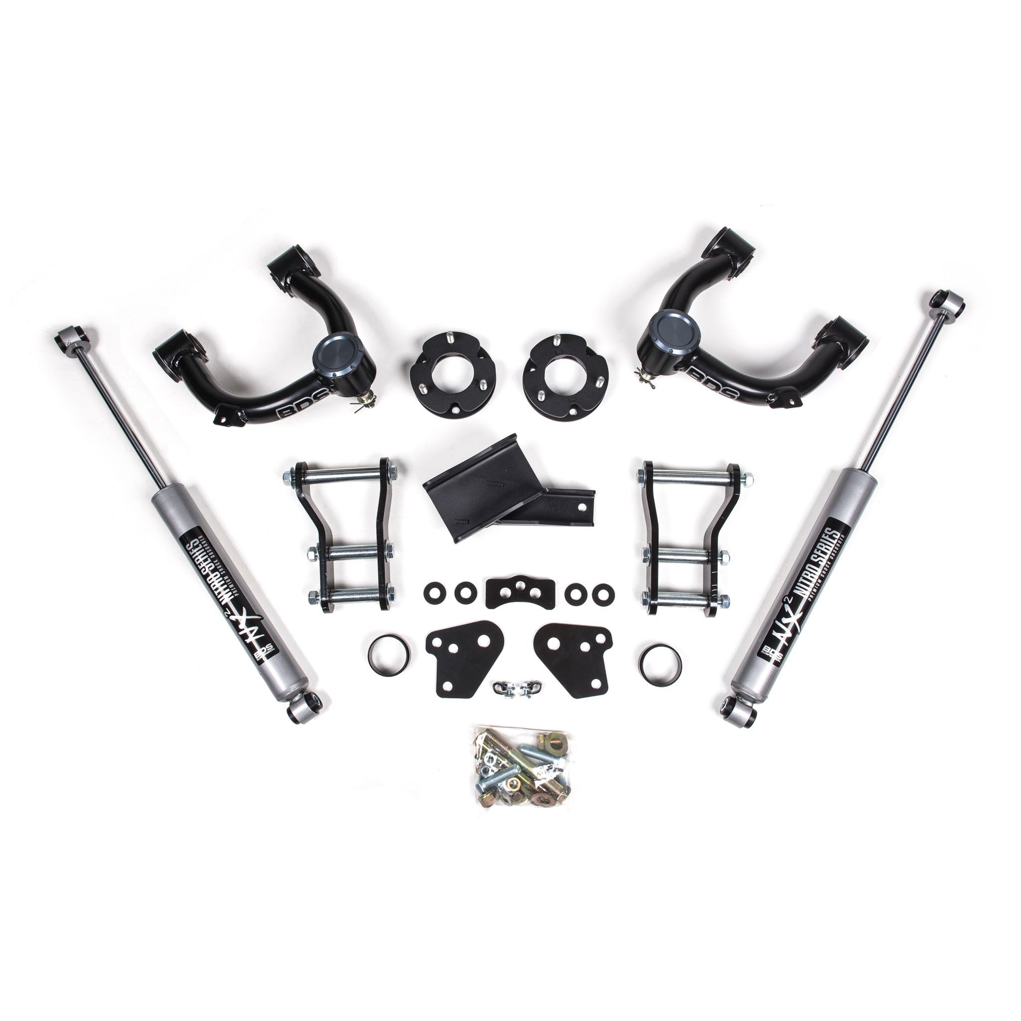 <p>To prevent maxing out ball joints or CV damage, BDS gets around this issue by using a 2-piece design with a smaller top mounted steel strut spacer in combination with a preload spacer. To further ensure proper drivetrain geometry the front differential is repositioned using relocation brackets. These brackets correct CV axle angle while allowing the use of the factory front skid plates. Also supplied for the front end are a pair of performance upper control arms (UCAs) designed for improved strength and suspension travel. </p>