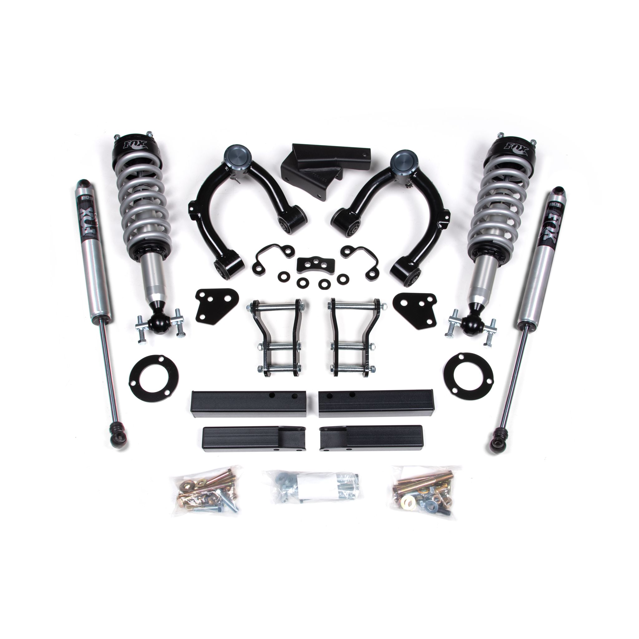 <p>Up front, the lift kit includes steel top mount strut spacers, pre-load spacers, differential relocation brackets and tubular upper control arms. In the rear, this kit includes heavy duty lift shackles and custom-tuned matching FOX 2.0 Performance series shocks. </p>