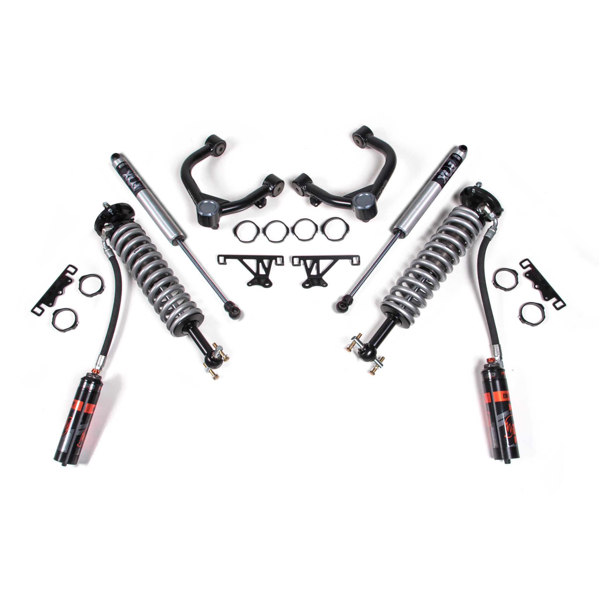 <p>Up front the lift kit includes FOX 2.5 Factory Series remote reservoir coil-over shocks and heavy duty tubular upper control arms for increased strength. In the rear this kit utilizes a complementary set of FOX 2.0 Performance shocks for the smoothest ride.</p>