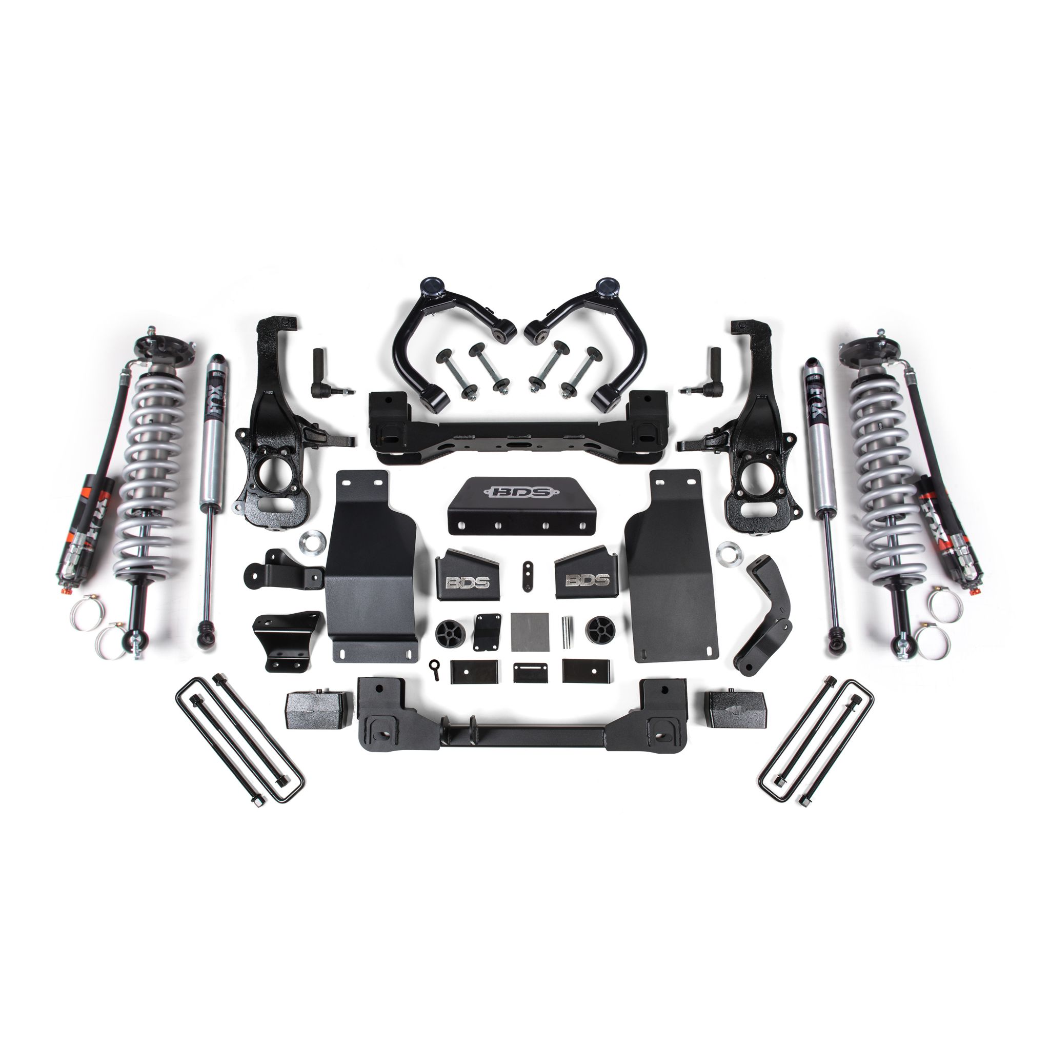 <p>This kit takes advantage of BDS's tried and true high-clearance design for improved ground clearance, strength, and offroad protection while correcting suspension and steering geometry for great on-road handling characteristics. Up front, the kit utilizes FOX 2.5 Performance Elite coil-over shocks, high-arched 1/4-inch thick steel crossmembers along with a multipiece differential relocation brackets and heavy duty skid plates built for offroad protection. Steering geometry is corrected at the new taller ride height with CNC-machined ductile iron steering knuckles and replacement tie rod ends allowing for ESC system compatibility. These combined with the provided sway bar drops, bump stop extensions, brake line brackets, CV spacers, supplied hardware and more provide a comprehensive front suspension lift ready for whatever you throw at it.</p>