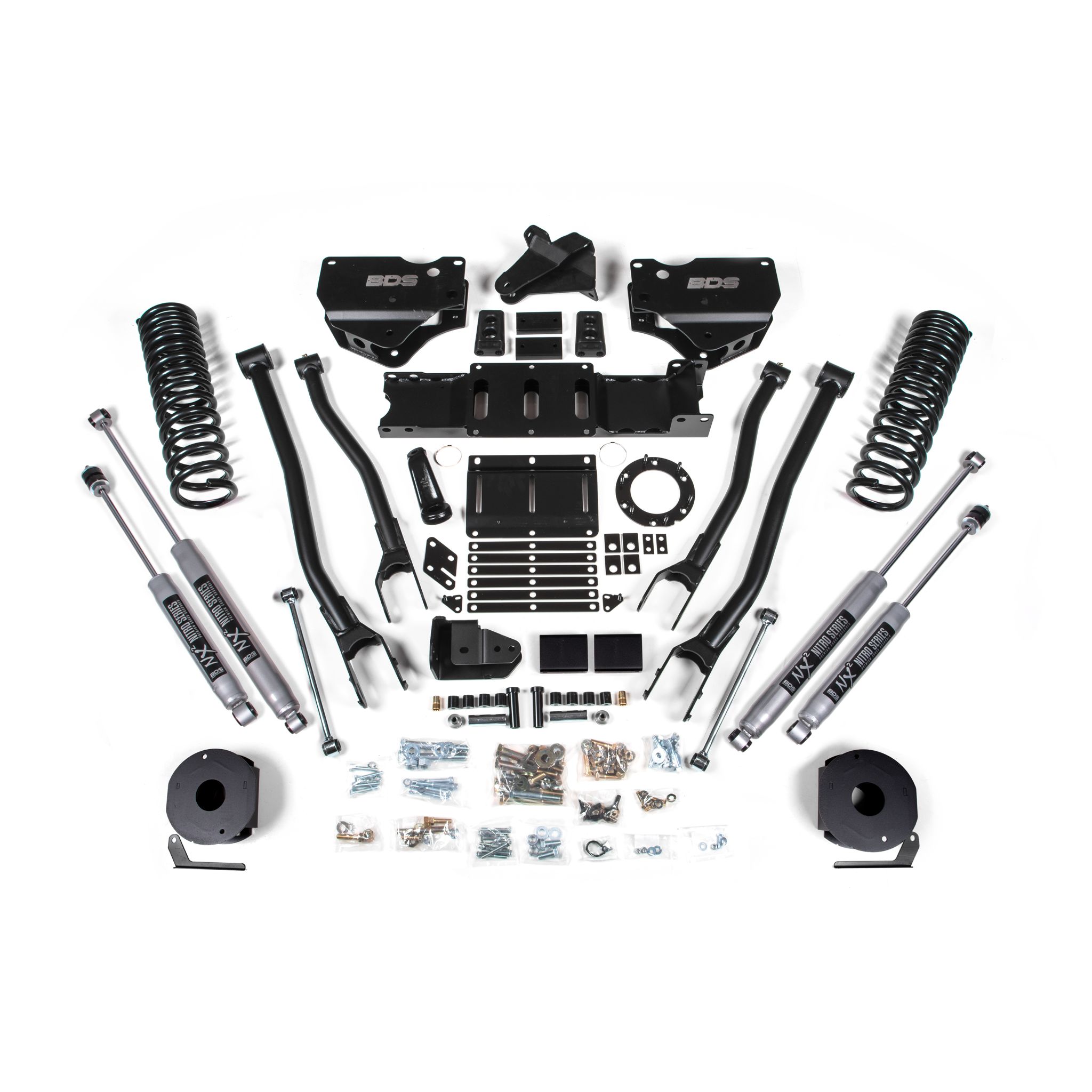 <p>Built to outperform, BDS Suspension engineered a 4-inch lift kit with 4-Link conversion for your 2019-2024 RAM 2500 diesel powered truck that will surely impress. Designed to improve stance, performance, and capability, this kit includes everything necessary to set your truck up right with clearance for up to 35" tires.</p><p><br></p><p>Up front the lift kit includes diesel-specific Pro-Ride coil springs, 4-Link control arms with conversion mounts, forged drop pitman arm and track bar bracket for steering correction, bump stops, brake line brackets and precision tuned NX2 or FOX 2.0 nitrogen charged shocks.</p><p><br></p><p>At this height, the transfer case needs to be indexed to allow use of the factory front driveshaft so an indexing ring and new transmission crossmember are supplied. In the rear this kit utilizes heavy duty rear air bag spacers, track bar relocation bracket to correct axle positioning, bump stop extensions, sway bar links and a matching set of NX2 Nitro or FOX 2.0 Performance shocks.</p><h2>4-Link Conversion</h2><p>Convert the factory stamped steel radius arms over to the BDS 4-link to optimize suspension geometry for better handling characteristics while adding strength and stability. This bolt-on upgrade utilizes high-strength 1/4-inch steel brackets that allow mounting of HD upper and lower control arms to correct axle positioning while limiting caster change throughout wheel travel.</p><h2>Pro-Ride Coil Springs</h2><p>A pair of full-length, diesel-specific, progressive rate Pro-Ride coil springs are supplied to provide the correct lift height and smooth, predictable ride across various terrains. Manufactured from high tensile steel, our direct OE replacement coil springs are engineered with properly sized wire diameter. This results in maximum reliability without premature coil bind.</p><h2>Steering Correction</h2><p>To optimize steering geometry once lifted, a forged drop pitman arm is used to minimize the steering angle and pair it