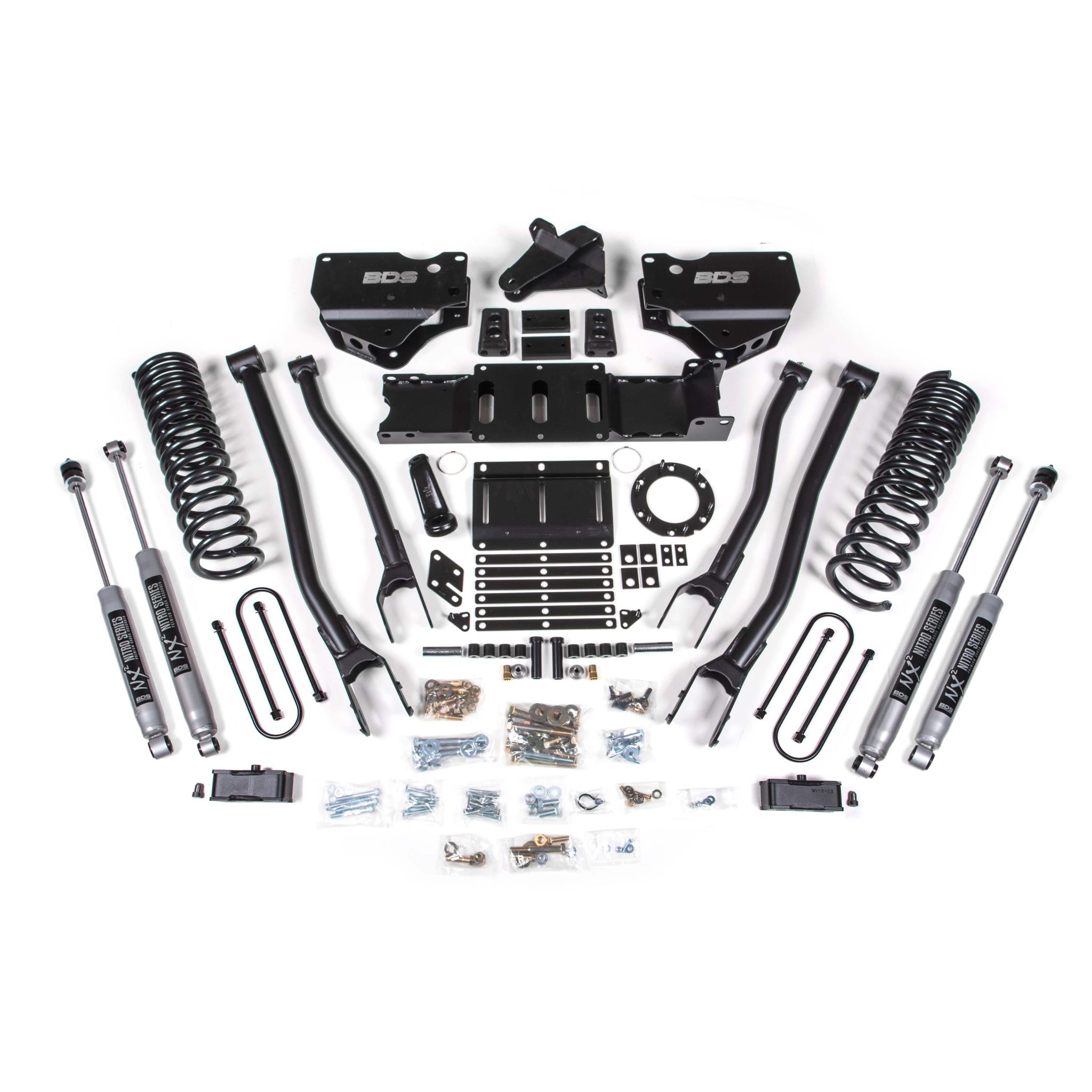 <p>Raise your RAM 3500 gas powered truck to the next heights with this 4-inch lift kit with 4-Link conversion from BDS Suspension. Designed to improve stance, performance, and capability, this kit includes everything necessary to set your truck up right with clearance for up to 35" tires.</p><p><br></p><p>Up front the lift kit includes gas-specific Pro-Ride coil springs, 4-Link control arms and conversion brackets, forged drop pitman arm and track bar bracket for steering correction, sway bar relocation, brake line brackets and precision tuned NX2 or FOX 2.0 nitrogen charged shocks.</p><p><br></p><p>At this height, the transfer case needs to be indexed to allow use of the factory front driveshaft so an indexing ring and new transmission crossmember are supplied. In the rear this kit utilizes a high-strength steel lift block, longer u-bolts and a matching set of NX2 Nitro or FOX 2.0 Performance shocks.</p><div><br></div>