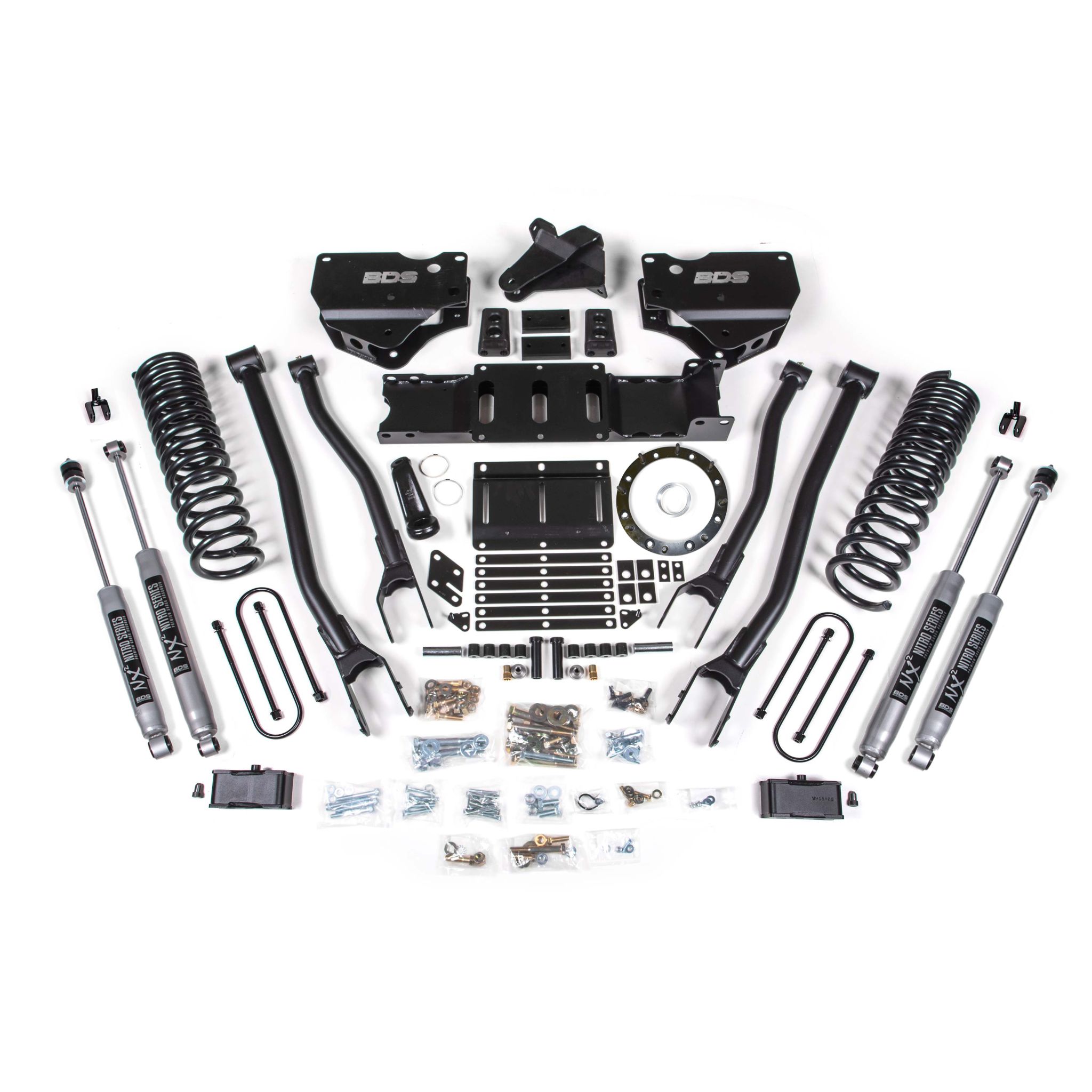 <p>Convert the factory stamped steel radius arms over to the BDS 4-link to optimize suspension geometry for better handling characteristics while adding strength and stability. This bolt-on upgrade utilizes high-strength 1/4-inch steel brackets that allow mounting of HD upper and lower control arms to correct axle positioning while limiting caster change throughout wheel travel.</p><h2>Pro-Ride Coil Springs</h2>