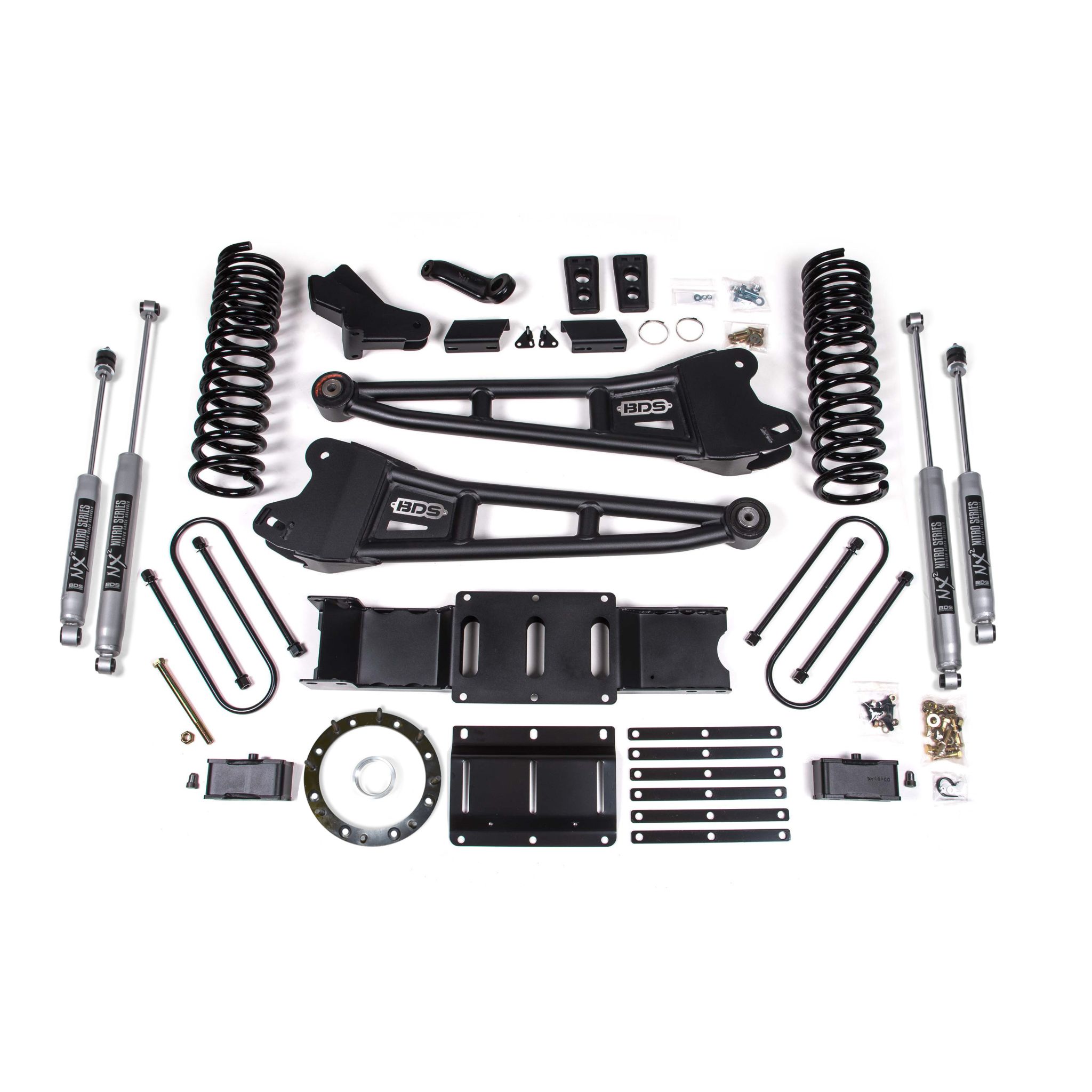 <p>Take your RAM 3500 diesel powered truck to the next level with this 4-inch radius arm lift kit from BDS Suspension. Designed to improve stance, performance, and capability, this kit includes everything necessary to set your truck up right with clearance for up to 35" tires.</p><p>Up front the lift kit includes diesel-specific Pro-Ride coil springs, heavy-duty replacement radius arms, forged drop pitman arm and track bar bracket for steering correction, sway bar relocation, brake line brackets and precision tuned NX2 or FOX 2.0 nitrogen charged shocks.</p><p>At this height, the transfer case needs to be indexed to allow use of the factory front driveshaft so an indexing ring and new transmission crossmember are supplied. In the rear this kit utilizes a high-strength fabricated lift block, longer u-bolts and a matching set of NX2 Nitro or FOX 2.0 Performance shocks.</p><h2>HD Radius Arms</h2><p>In place of the factory stamped steel radius arms BDS supplies a pair of high-strength tubular radius arms. These arms mount into the factory location and offer caster adjustment for a wide range of lift heights along with an OE-style rubber bushing at the frame mount for smooth, quiet, service-free operation.</p><h2>Pro-Ride Coil Springs</h2><p>A pair of full-length, diesel-specific, progressive rate Pro-Ride coil springs are supplied to provide the correct lift height and smooth, predictable ride across various terrains.</p><h2>Steering Correction</h2><p>To optimize steering geometry once lifted, a forged drop pitman arm is used to minimize the steering angle and pair it with a heavy duty track bar drop bracket to keep them in phase through suspension travel while recentering the front axle.</p>