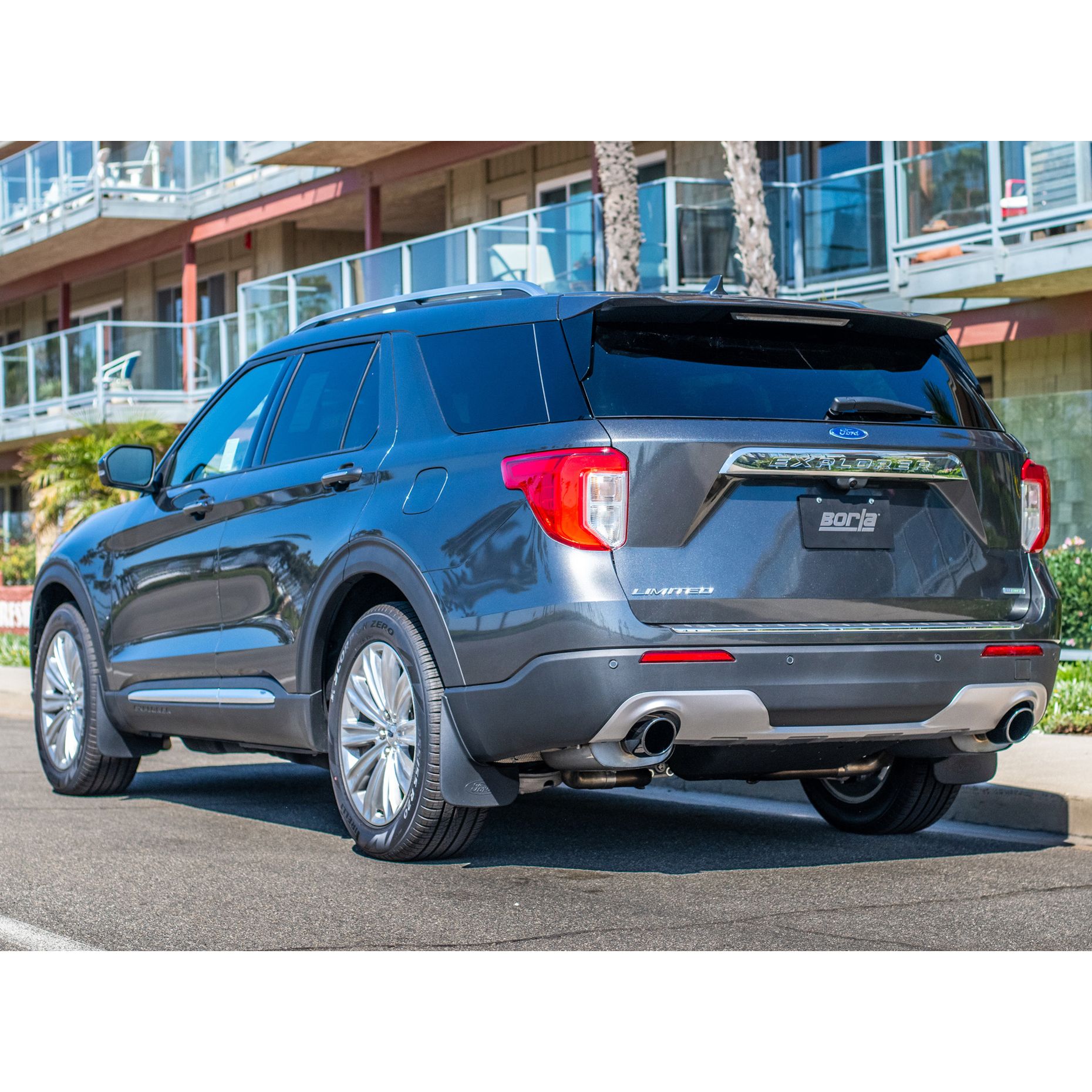 Fits vehicles WITH optional Factory Chrome Tips. Borla(r) is proud to present their exhaust systems for the Ford Explorer Limited. Our Cat-Back(tm) systems have been specifically developed for the 2.3L EcoBoost engine with performance and sound in mind. The S-Type Cat-Back(tm) system delivers a balanced, sporty sound without adding any drone to ensure an enjoyable driving experience. This system features bright chrome on T-304 stainless steel tips, but is also available with black chrome tips. Our exhaust is constructed using premium T-304 stainless steel and bolts on to the factory system for stress-free installation. Add power and a balanced, sporty sound to your Explorer Limited, bolt on a Borla(r). Cat-Back(tm) Exhaust System S-Type Sound Level No Drone 4" Bright Chrome On T-304 Stainless Steel Tips Bolt On Installation T-304 Stainless Steel Construction Million-Mile Warranty Best of all, Borla(r) stands behind every system with a Million-Mile Warranty. Just what you'd expect from the world's most experienced (and most winning) exhaust brand.