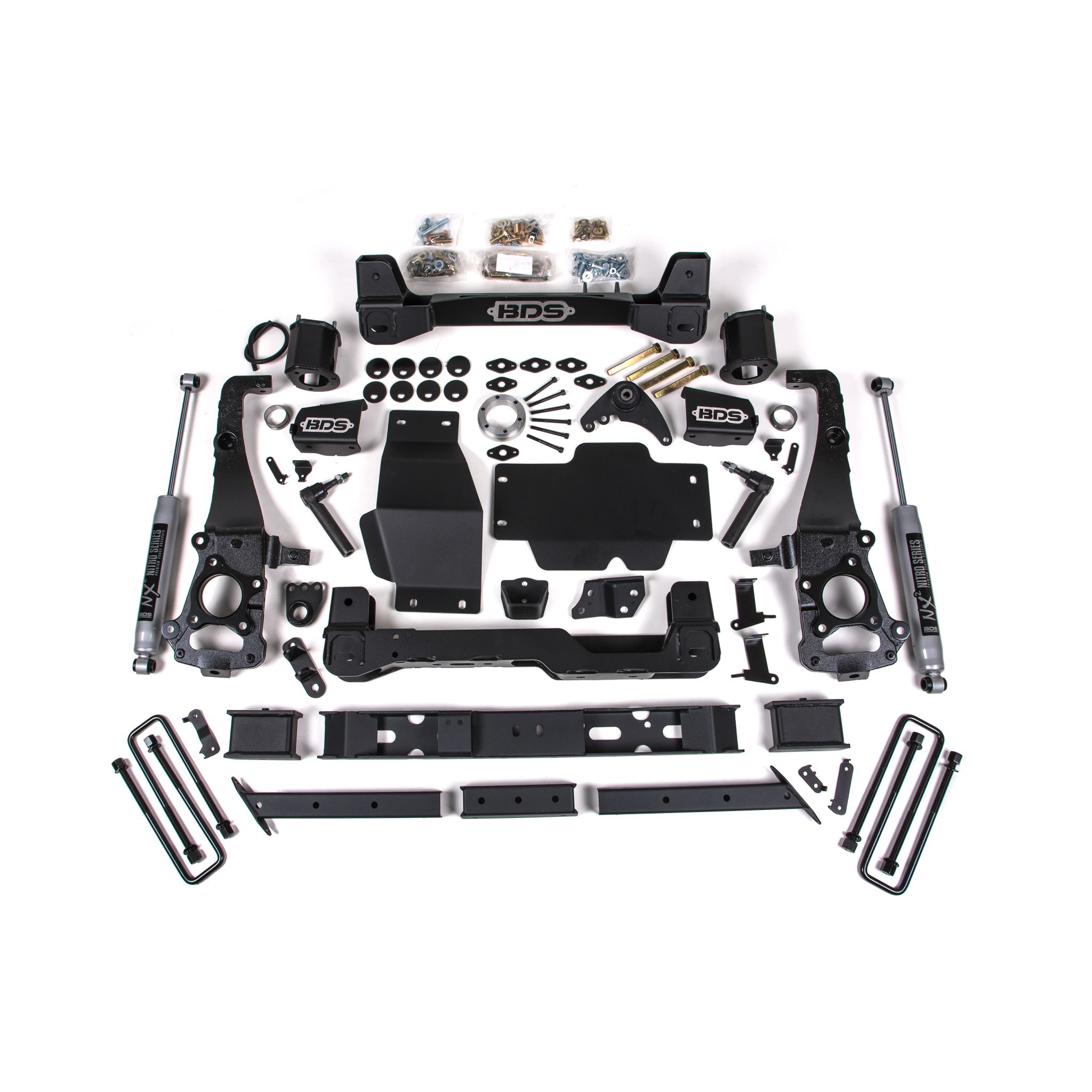 <p>In the rear BDS utilizes a heavy duty replacement transfer case cross-member, high strength fabricated lift blocks and longer u-bolts to lift and level the stance along and NX2 Nitro or optional FOX 2.0 Performance Series shocks.</p>