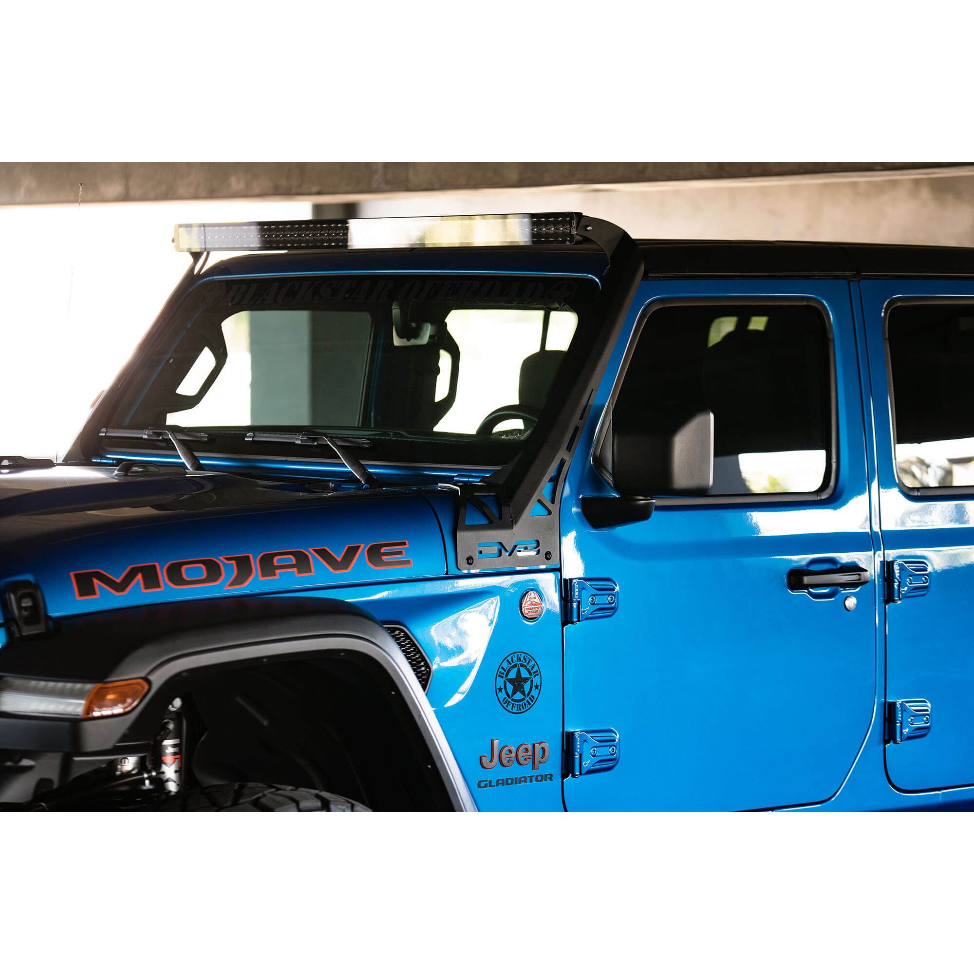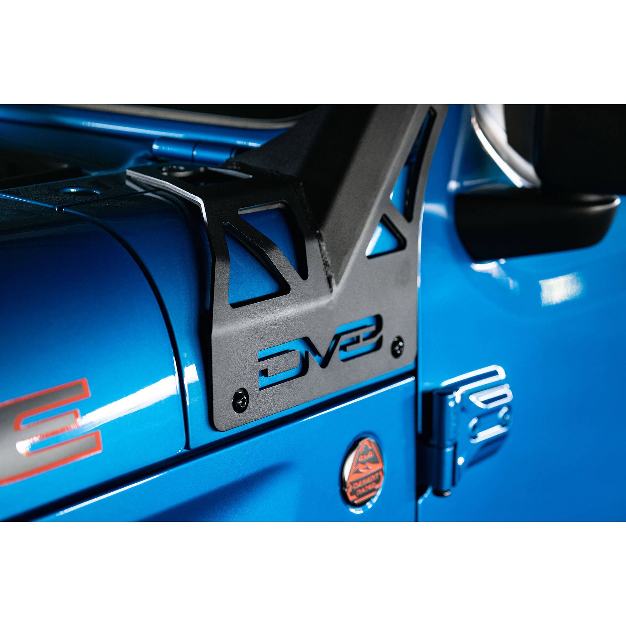 The DV8 392/Mojave Edition A-Pillar Light Bar Mount is designed to accommodate an over-windshield LED light bar, with mounting points that are 52-inches apart end to end. The brackets were designed to conceal the wire harness running from the light bar into the engine bay, keeping a clean appearance.