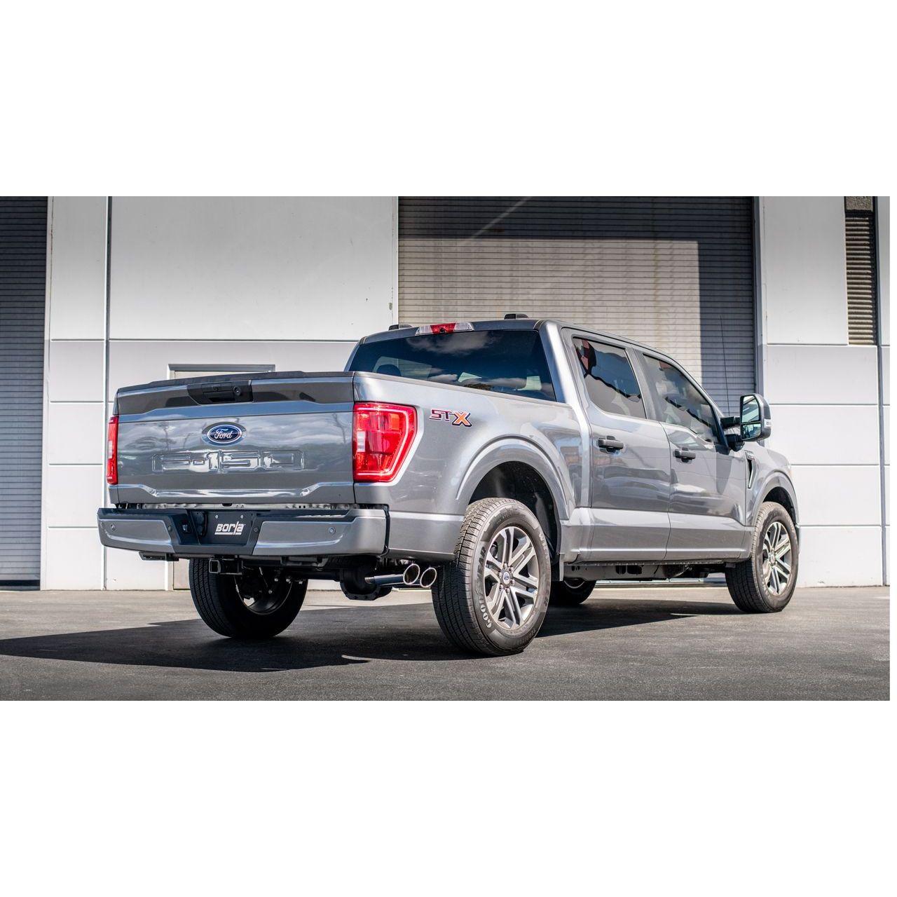 The 3" into dual 2.5" Borla(r) Cat-Back(tm) system was specifically designed to enhance the power and sound of the Ford F-150 equipped with 2.7L and 3.5L engines. The dual side (passenger side) exit configuration replaces the single factory tail pipe, and has single 4" round bright chrome on T-304 stainless steel tips on each tail pipe. A system with black chrome on T-304 stainless steel tips is also available. This system features the popular S-Type sound with no drone. Additional systems are available with different options for sound level, tip finish and tip exits. Add Adapter 60556 for Crew Cab with Standard Bed (6' 7") 157.2" Wheelbase vehicles. Add Adapter 60564 for Extended Cab with Long Bed (8' 2") 164.1" Wheelbase vehicles. Borla(r) Cat-Back(tm) & Axle-Back exhaust systems feature patented straight-through and multi-core technology to unleash hidden horsepower. Increased exhaust velocity adds power, driving excitement, fuel economy, and the distinctive Borla(r) Sound of Power respected by motoring enthusiasts everywhere. Each system is built from premium, high-quality T-304 austenitic stainless steel, superior to T-400 series knockoffs (such as 409), to give you the absolute best in performance and durability. Ultra-smooth mandrel bends ensure maximum flow & power, and precision computer numerical control (CNC) manufacturing ensures an accurate fit. All this is backed by our unsurpassed Million Mile Warranty. System Features: Cat-Back(tm) System Dual Side Exit 4" Round Bright Chrome On T-304 Stainless Steel Tips S-Type Sound Level T-304 Stainless Steel Construction Bolt-On Installation Million Mile Warranty
