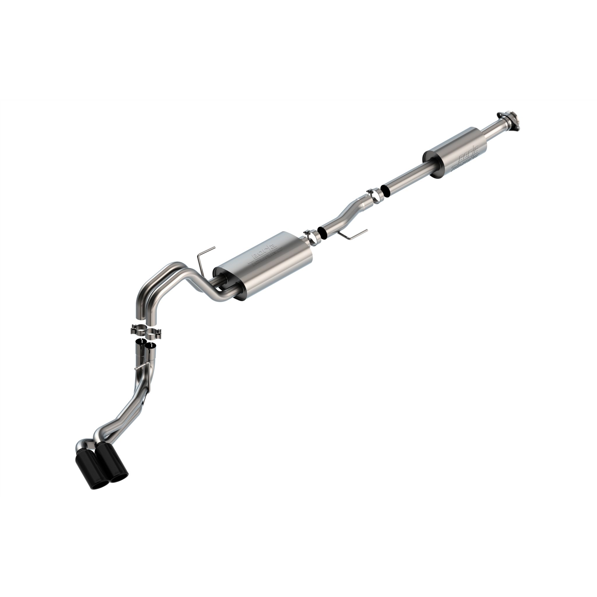 The 3" into dual 2.25" Borla(r) Cat-Back(tm) system was specifically designed to enhance the power and sound of the Ford F-150 equipped with 2.7L and 3.5L engines. The dual side (passenger side) exit configuration replaces the single factory tail pipe, and has single 4" round black chrome T-304 stainless steel tips on each tail pipe. Using Borla(r) Stainless Steel Polish p# 21461 is NOT recommended with these black chrome tips. We suggest cleaning the tips with hot water and a microfiber cloth. A system with bright chrome on T-304 stainless steel tips is also available. This system features the mellow Touring sound that gives you a mild sound of power with no drone. Additional systems are available with different options for sound level, tip finish and tip exits. Add Adapter 60556 for Crew Cab with Standard Bed (6' 7") 157.2" Wheelbase vehicles. Add Adapter 60564 for Extended Cab with Long Bed (8' 2") 164.1" Wheelbase vehicles. Borla(r) Cat-Back(tm) & Axle-Back exhaust systems feature patented straight-through and multi-core technology to unleash hidden horsepower. Increased exhaust velocity adds power, driving excitement, fuel economy, and the distinctive Borla(r) Sound of Power respected by motoring enthusiasts everywhere. Each system is built from premium, high-quality T-304 austenitic stainless steel, superior to T-400 series knockoffs (such as 409), to give you the absolute best in performance and durability. Ultra-smooth mandrel bends ensure maximum flow & power, and precision computer numerical control (CNC) manufacturing ensures an accurate fit. All this is backed by our unsurpassed Million Mile Warranty. System Features: Cat-Back(tm) System Dual Side Exit 4" Round Black Chrome On T-304 Stainless Steel Tips Touring Sound Level T-304 Stainless Steel Construction Bolt-On Installation Million Mile Warranty