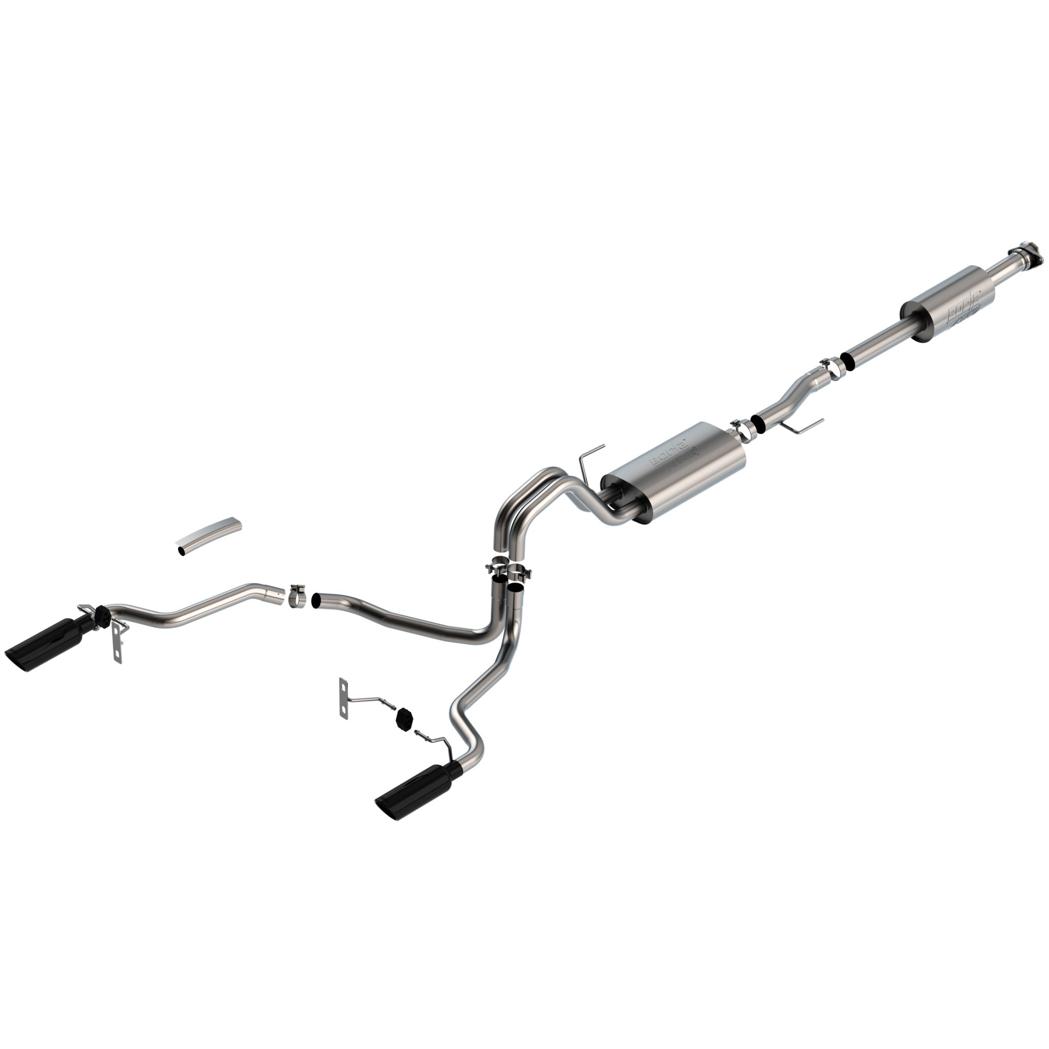 The 3" diameter into dual 2.25" Borla(r) Cat-Back(tm) system was specifically designed to enhance the power and sound of the Ford F-150 equipped with 3.3L engine. The split rear exit configuration replaces the single factory tail pipe, and has single 4" round black chrome on T-304 stainless steel tips on each tail pipe. Using Borla(r) Stainless Steel Polish p# 21461 is NOT recommended with these black chrome tips. We suggest cleaning the tips with hot water and a microfiber cloth. A system with bright chrome on T-304 stainless steel tips is also available. This system features the aggressive ATAK(r) sound with no drone. Additional systems are available with different options for sound level, tip finish and tip exits. Add adapter 60556 for Crew Cab with Standard Bed (6' 7") 157.2" Wheelbase vehicles. Add adapter 60564 for Extended Cab with Long Bed (8' 2") 164.1" Wheelbase vehicles. Borla(r) Cat-Back(tm) & Axle-Back exhaust systems feature patented straight-through and multi-core technology to unleash hidden horsepower. Increased exhaust velocity adds power, driving excitement, fuel economy, and the distinctive Borla(r) Sound of Power respected by motoring enthusiasts everywhere. Each system is built from premium, high-quality T-304 stainless steel, to give you the absolute best in performance and durability. Ultra-smooth mandrel bends ensure maximum flow & power, and computer numerical control (CNC) manufacturing ensures an accurate fit. All this is backed by our unsurpassed Million Mile Warranty. System Features: Cat-Back(tm) System Split Rear Exit 4" Round Black Chrome On T-304 Stainless Steel Tips ATAK(r) Sound Level T-304 Stainless Steel Construction Bolt-On Installation Million Mile Warranty