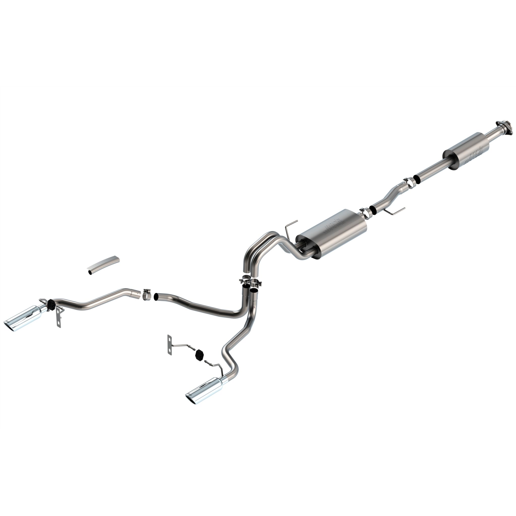 The 3" diameter into dual 2.25" Borla(r) Cat-Back(tm) system was specifically designed to enhance the power and sound of the Ford F-150 equipped with 3.3L engine. The split rear exit configuration replaces the single factory tail pipe, and has single 4" round bright chrome on T-304 stainless steel tips on each tail pipe. A system with black chrome on T-304 stainless steel tips is also available. This system features the popular S-Type sound with no drone. Additional systems are available with different options for sound level, tip finish and tip exits. Add adapter 60556 for Crew Cab with Standard Bed (6' 7") 157.2" Wheelbase vehicles. Add adapter 60564 for Extended Cab with Long Bed (8' 2") 164.1" Wheelbase vehicles. Borla(r) Cat-Back(tm) & Axle-Back exhaust systems feature patented straight-through and multi-core technology to unleash hidden horsepower. Increased exhaust velocity adds power, driving excitement, fuel economy, and the distinctive Borla(r) Sound of Power respected by motoring enthusiasts everywhere. Each system is built from premium, high-quality T-304 stainless steel, to give you the absolute best in performance and durability. Ultra-smooth mandrel bends ensure maximum flow & power, and computer numerical control (CNC) manufacturing ensures an accurate fit. All this is backed by our unsurpassed Million Mile Warranty. System Features: Cat-Back(tm) System Split Rear Exit 4" Round Bright Chrome On T-304 Stainless Steel Tips S-Type Sound Level T-304 Stainless Steel Construction Bolt-On Installation Million Mile Warranty