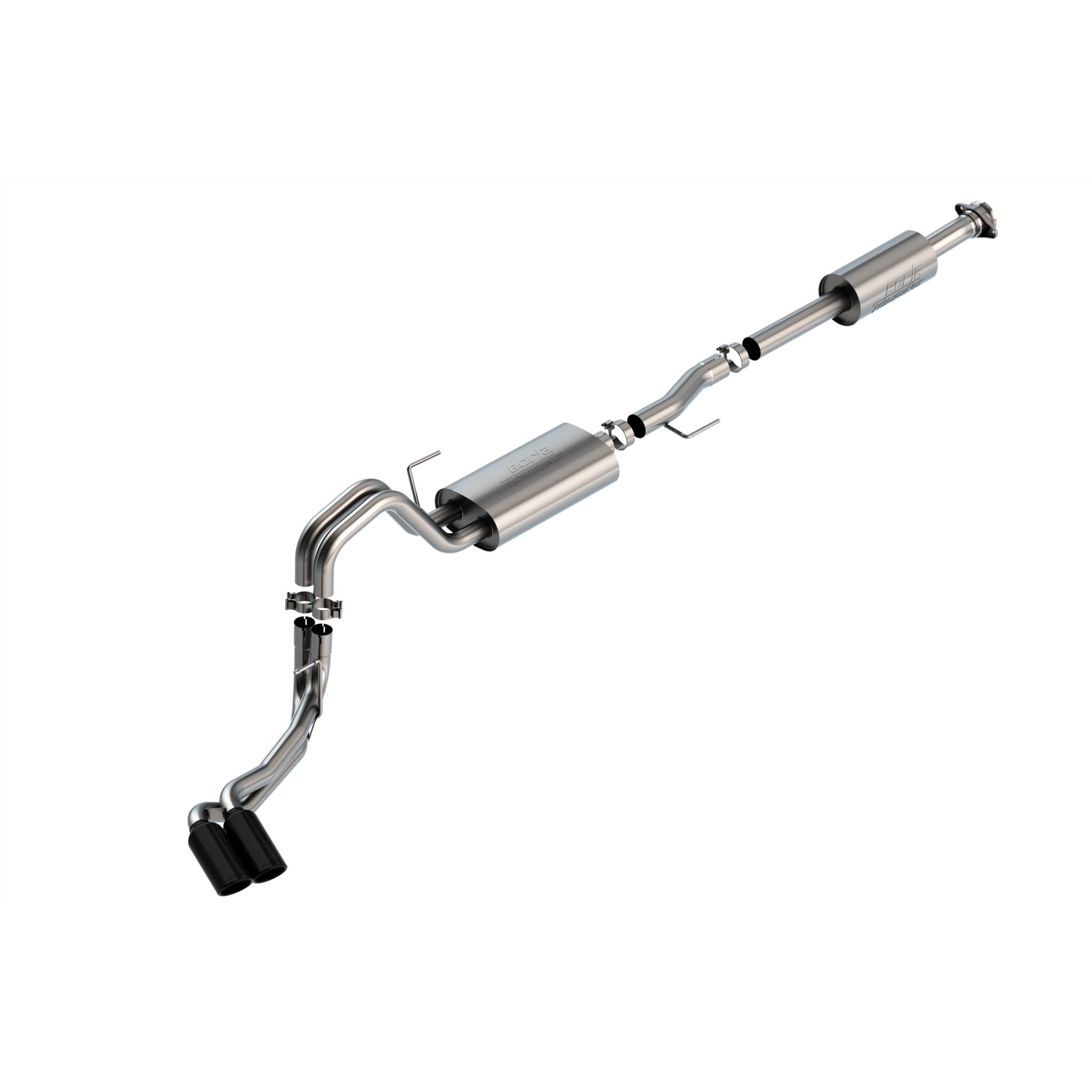 The 3" diameter into dual 2.25" Borla(r) Cat-Back(tm) system was specifically designed to enhance the power and sound of the Ford F-150 equipped with the 5.0L V8 engine. The dual side (passenger side) exit configuration replaces the single factory tail pipe, and has single 4" round black chrome on T-304 stainless steel tips on each tail pipe. Using Borla(r) Stainless Steel Polish p# 21461 is NOT recommended with these black chrome tips. We suggest cleaning the tips with hot water and a microfiber cloth. A system with bright chrome on T-304 stainless steel tips is also available. This system features the mellow Touring sound that gives you a mild sound of power with no drone. Additional systems are available with different options for sound level, tip finish and tip exits. Add adapter 60556 for Crew Cab with Standard Bed (6' 7") 157.2" Wheelbase vehicles. Add adapter 60564 for Extended Cab with Long Bed (8' 2") 164.1" Wheelbase vehicles. Borla(r) Cat-Back(tm) & Axle-Back exhaust systems feature patented straight-through and multi-core technology to unleash hidden horsepower. Increased exhaust velocity adds power, driving excitement, fuel economy, and the distinctive Borla(r) Sound of Power respected by motoring enthusiasts everywhere. Each system is built from premium, high-quality T-304 austenitic stainless steel, superior to T-400 series knockoffs (such as 409), to give you the absolute best in performance and durability. Ultra-smooth mandrel bends ensure maximum flow & power, and precision computer numerical control (CNC) manufacturing ensures an accurate fit. All this is backed by our unsurpassed Million Mile Warranty. System Features: Cat-Back(tm) System Dual Side Exit 4" Round Black Chrome On T-304 Stainless Steel Tips Touring Sound Level T-304 Stainless Steel Construction Bolt-On Installation Million Mile Warranty