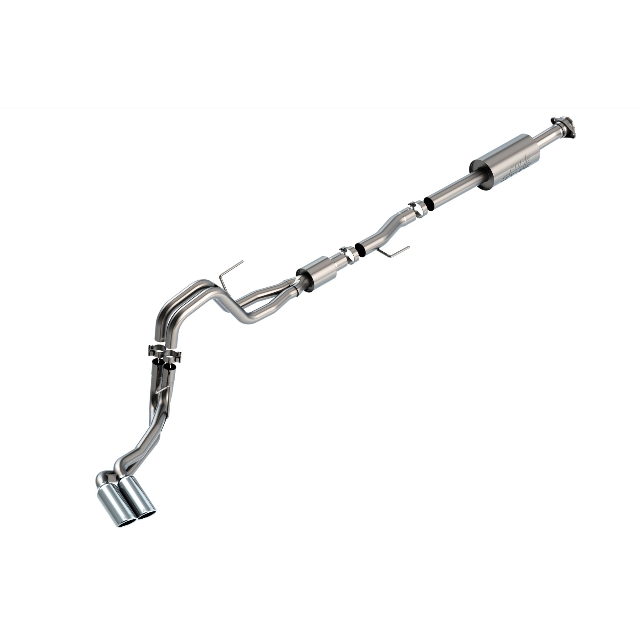 The 3" diameter into dual 2.25" Borla(r) Cat-Back(tm) system was specifically designed to enhance the power and sound of the Ford F-150 equipped with the 5.0L V8 engine. The dual side (passenger side) exit configuration replaces the single factory tail pipe, and has single 4" round bright chrome T-304 stainless steel tips on each tail pipe. This system features the popular S-Type sound with no drone. Additional systems are available with different options for sound level, tip finish and tip exits. Add adapter 60556 for Crew Cab with Standard Bed (6' 7") 157.2" Wheelbase vehicles. Add adapter 60564 for Extended Cab with Long Bed (8' 2") 164.1" Wheelbase vehicles. Borla(r) Cat-Back(tm) & Axle-Back exhaust systems feature patented straight-through and multi-core technology to unleash hidden horsepower. Increased exhaust velocity adds power, driving excitement, fuel economy, and the distinctive Borla(r) Sound of Power respected by motoring enthusiasts everywhere. Each system is built from premium, high-quality T-304 austenitic stainless steel, superior to T-400 series knockoffs (such as 409), to give you the absolute best in performance and durability. Ultra-smooth mandrel bends ensure maximum flow & power, and precision computer numerical control (CNC) manufacturing ensures an accurate fit. All this is backed by our unsurpassed Million Mile Warranty. System Features: Cat-Back(tm) System Dual Side Exit 4" Round Bright Chrome On T-304 Stainless Steel Tips S-Type Sound Level T-304 Stainless Steel Construction Bolt-On Installation Million Mile Warranty
