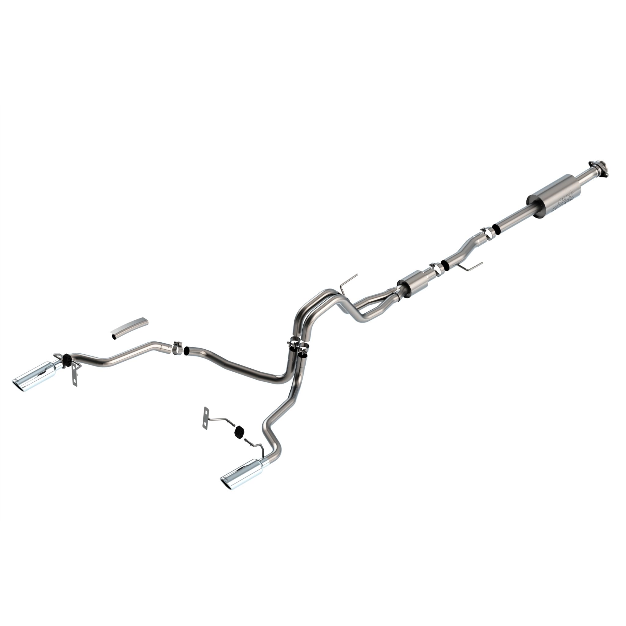 The 3" diameter into dual 2.25" Borla(r) Cat-Back(tm) system 140866 was specifically designed to enhance the power and sound of the Ford F-150 equipped with the 5.0L V8 engine. The split rear exit configuration replaces the single factory tail pipe, and has single 4" round bright chrome on T-304 stainless steel tips on each tail pipe. A system with black chrome on T-304 stainless steel tips is also available. This system features the popular S-Type sound with no drone. Additional systems are available with different options for sound level, tip finish and tip exits. Add adapter 60556 for Crew Cab with Standard Bed (6' 7" 157.2" Wheelbase vehicles. Add adapter 60564 for Extended Cab with Long Bed (8' 2") 164.1" Wheelbase vehicles. Borla(r) Cat-Back(tm) & Axle-Back exhaust systems feature patented straight-through and multi-core technology to unleash hidden horsepower. Increased exhaust velocity adds power, driving excitement, fuel economy, and the distinctive Borla(r) Sound of Power respected by motoring enthusiasts everywhere. Each system is built from premium, high-quality T-304 austenitic stainless steel, superior to T-400 series knockoffs (such as 409), to give you the absolute best in performance and durability. Ultra-smooth mandrel bends ensure maximum flow & power, and precision computer numerical control (CNC) manufacturing ensures an accurate fit. All this is backed by our unsurpassed Million Mile Warranty. System Features: Cat-Back(tm) System Split Rear Exit 4" Round Bright Chrome On T-304 Stainless Steel Tips S-Type Sound Level T-304 Stainless Steel Construction Bolt-On Installation Million Mile Warranty