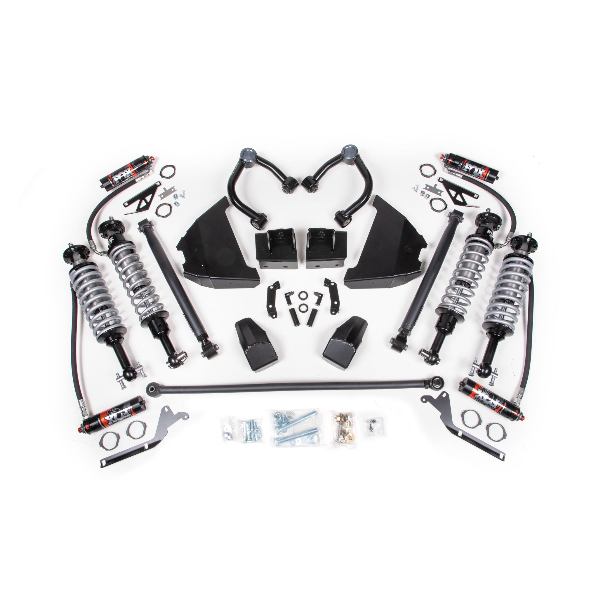 <p>Up front the lift kit includes FOX 2.5 Performance Elite Series remote reservoir coil-over shocks, heavy duty tubular upper control arms for increased strength, steering tie rod sleeves to increase diameter or stock tie rods, max tire clearance kit to fit 37" tires and lower control arm skid plates for the ultimate protection. In the rear, BDS utilizes a complementary set of FOX 2.5 Performance Elite coil-over shocks for an improved ride, -rear lower tubular control arms to give max flex, adjustable rear track bar to keep everything aligned, and a set of lower shock skids to prevent damage from rocks or debris.</p>