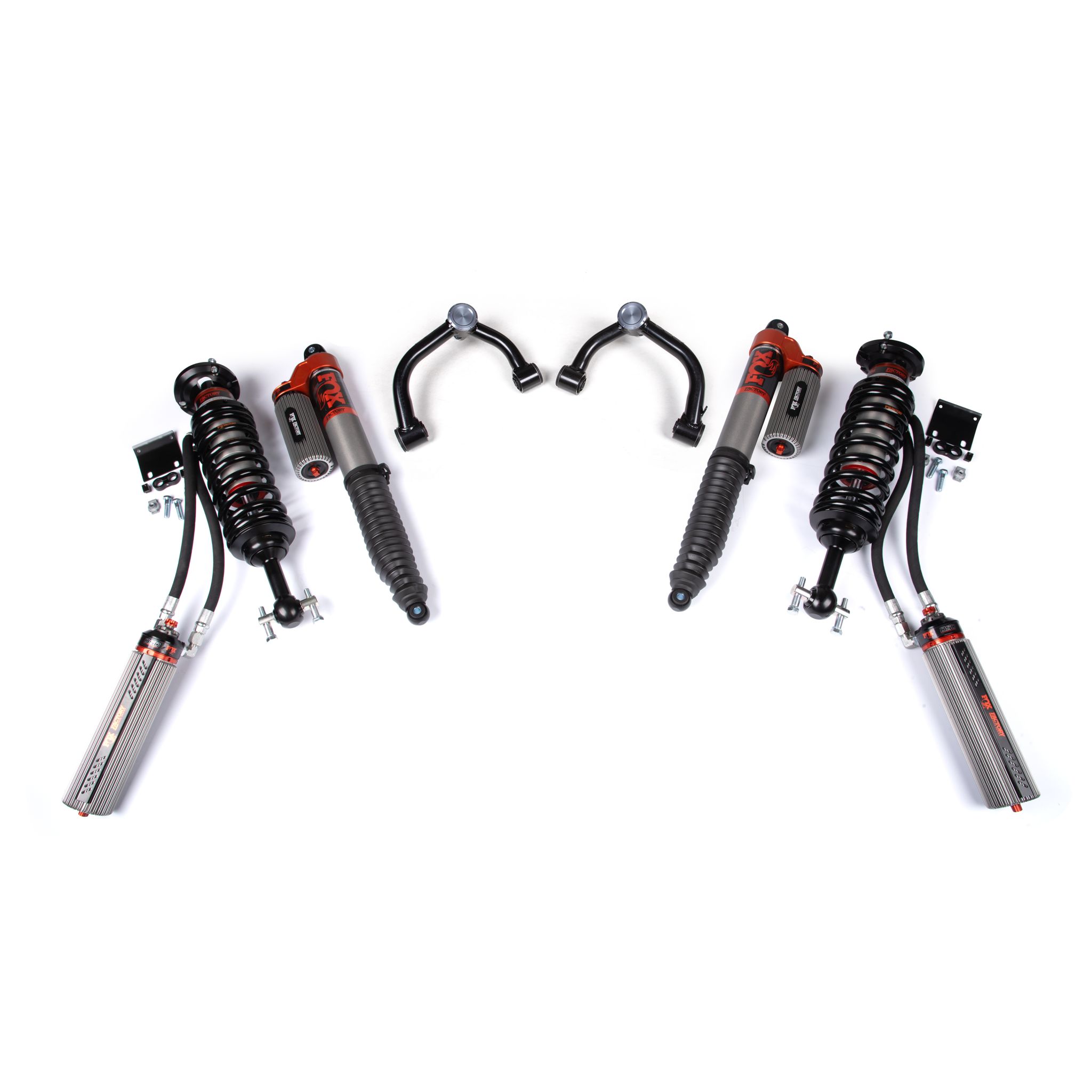 <p>Level out your 2021 Ford F150 truck and improve the ride with this 2.5 inch performance suspension system featuring FOX Factory Race Series 3.0 coil-over shocks from BDS Suspension. Designed to improve stance, performance, and capability, this kit includes everything necessary to set your truck up right with clearance for up to 35" tires.</p><p>Up front the lift kit includes FOX Factory Race Series 3.0 coil-over shocks and heavy duty tubular upper control arms for increased strength. In the rear this kit utilizes a matching set of FOX Factory Race Series 3.0 shocks for the smoothest ride.</p><p><br></p><p></p><h3>FOX Factory Race Series</h3><p></p><p>FOX Factory Race Series 3.0 Internal Bypass shocks for the Ford Bronco deliver position-sensitive damping technology, Dual Speed Compression (DSC) adjustment, and high-speed ready performance in a bolt-on kit.</p><p>Patented Internal Bypass technology allows for multiple zones of damping control. The result is a comfortable, confident ride with increased damping force through rough terrain. Internal bypass shocks produce more force progressively to control hard bottom-outs, prevent harsh top-outs, and provide an initial catch for landing. Shock fluid bypasses the main piston through a series of bleed holes in the ride zone. As the shock extends past the ride zone in rebound or compression, the bleed holes terminate, forcing fluid through the main piston.</p><p>Finned external reservoirs and aluminum shock bodies keep shock fluid temperatures cool for better performance. Type III anodization prevents corrosion and wear of the 3-inch diameter bodies. The DSC adjuster allows you to dial in your Bronco for load, environment, and driving style.</p><p>FOX Internal Bypass shocks deliver the support and confidence you need while driving high-speed through rugged terrain. Experience race-bred performance next time you leave the pavement.</p><p></p><h3>HD Upper Control Arms</h3><p></p><p>Built for strength, performance and inc