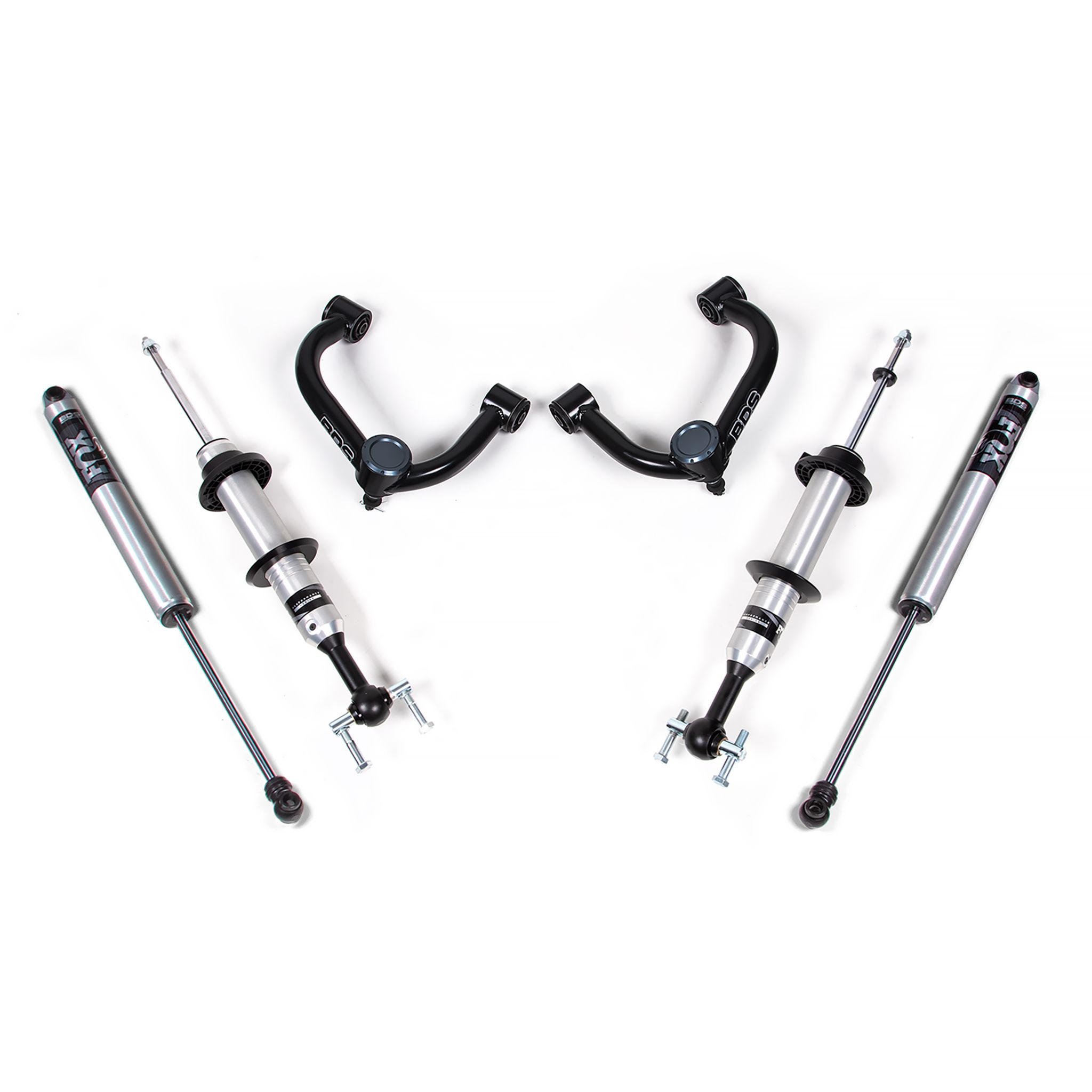 <p>Take your F150 to the next level by installing a FOX 2.0 Snap Ring Strut 2 inch leveling kit with heavy duty upper control arms. These kits use the FOX 2.0 Performance Series coilover struts for a bolt-in upgrade to fit up to 35×12.50 tires while providing improved damper performance across all terrains.</p><h2>FOX 2.0 Struts</h2><p>These FOX 2.0 Performance Series coil-over struts bring impressive damper performance for great ride on and offroad capability designed as a direct bolt-in replacement for the factory strut assemblies while retaining the OE coil spring and top plate. They feature a 2.0" extruded and machined 6061 T6 aluminum body for better heat dispersion, along with an internal floating piston (IFP) to eliminate oil aeration, FOX's proprietary internals, 5/8" hard chrome plated heat-treated alloy shaft. </p><h3>HD Upper Control Arms (UCAs)</h3><p>Built for strength, performance and increased travel, these upper control arms are ready to bolt-in with most leveled/lifted trucks. They use 1.5" OD x .120-wall tubular construction with an indexed ball joint cup to correct the ball joint positioning allowing additional down travel and camber adjustment. At the frame mounting ends are durometer-specific rubber bushings for maintenance-free operation while at the other end a quality greaseable ball joints for smooth, quiet operation and superior durability. Arms are finished in a durable black powder coat with a billet aluminum dust cap ready for installation right out of the box.</p>