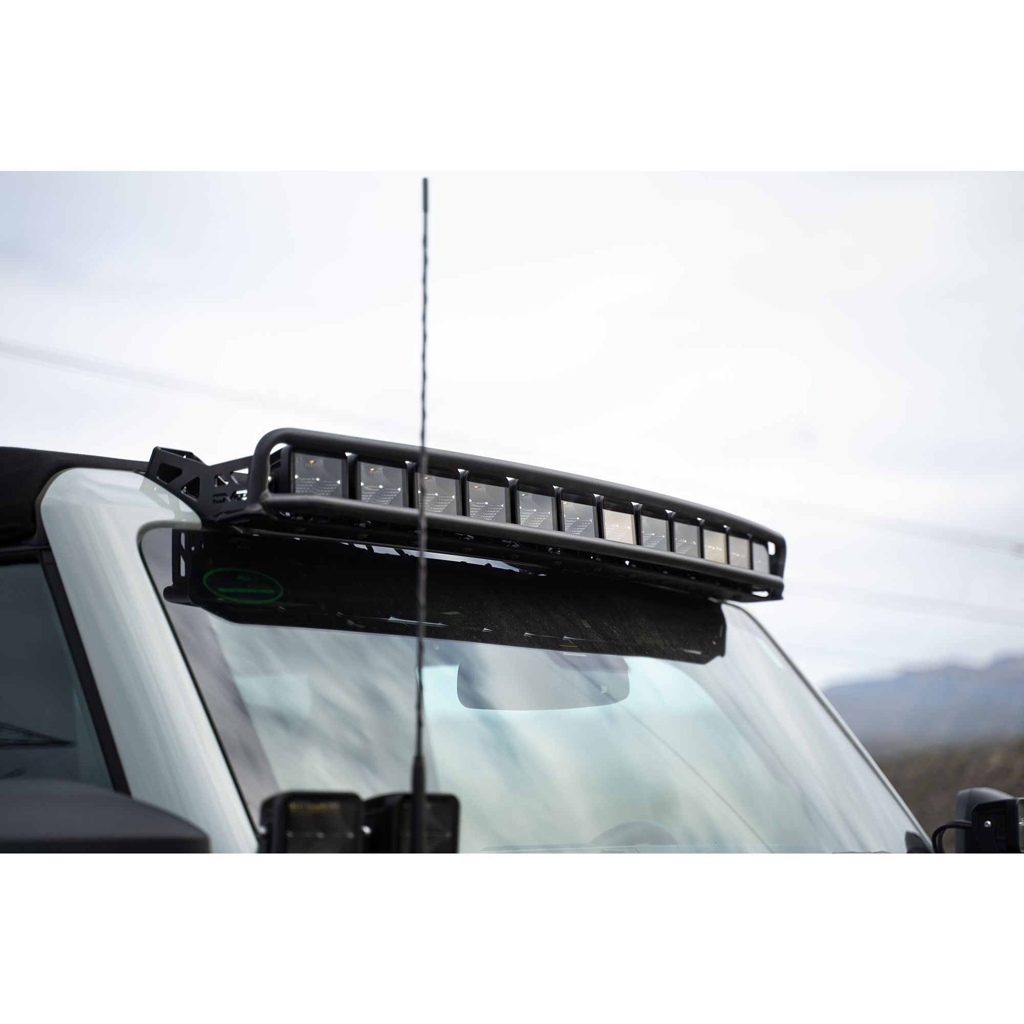 This light bracket was designed to mount a 40-inch curved LED light bar? above your 2021+ Ford Bronco windshield. Alternatively, you can mount up to 12 LED pod lights. This is the perfect way to provide the trail lighting you need when driving off-road in low-light conditions. The bracket is constructed with a combination of 3/4" diameter tube steel and 4mm thick plate steel and finished in our micro-texture black powder coat. No modifications are required for install, as this mounts directly to the OEM accessory mounts located above the windshield.