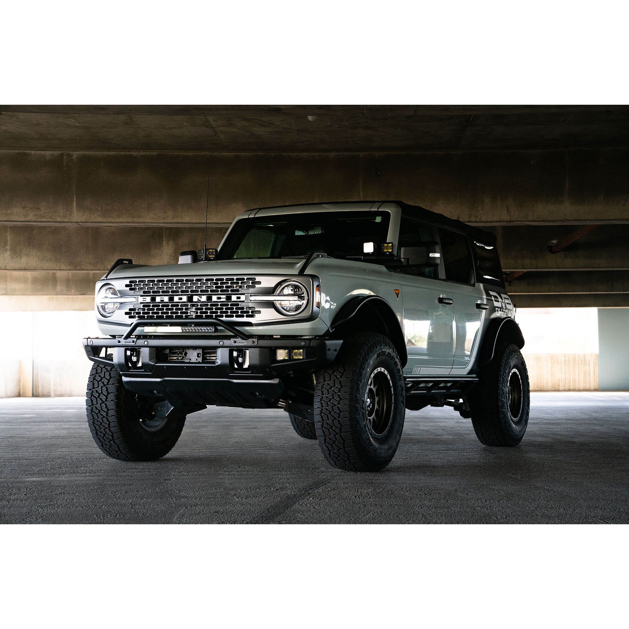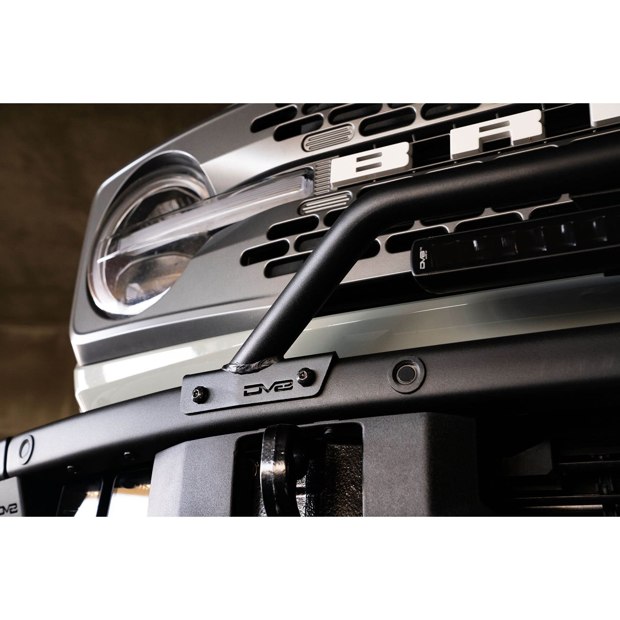 DV8 Offroad has designed a tubular bull bar for the Bronco's factory steel bumper that sits much lower in front of the grille than the OEM version, giving it a low profile appearance. The tube features 2 adjustable light mounts that allow for LED lighting to be mounted above or below the bar. Lighting options include mounting up to a 20-inch light bar above or below the tube, or a pod/round light on each of the 2 tabs. The mounting plates are constructed of 3mm steel, and the bar is made from 1.5-inch diameter x 1.5mm thick steel tubing. Installation is a simple half-hour process that utilizes the 8 factory bolts already present on the Bronco's steel bumper.